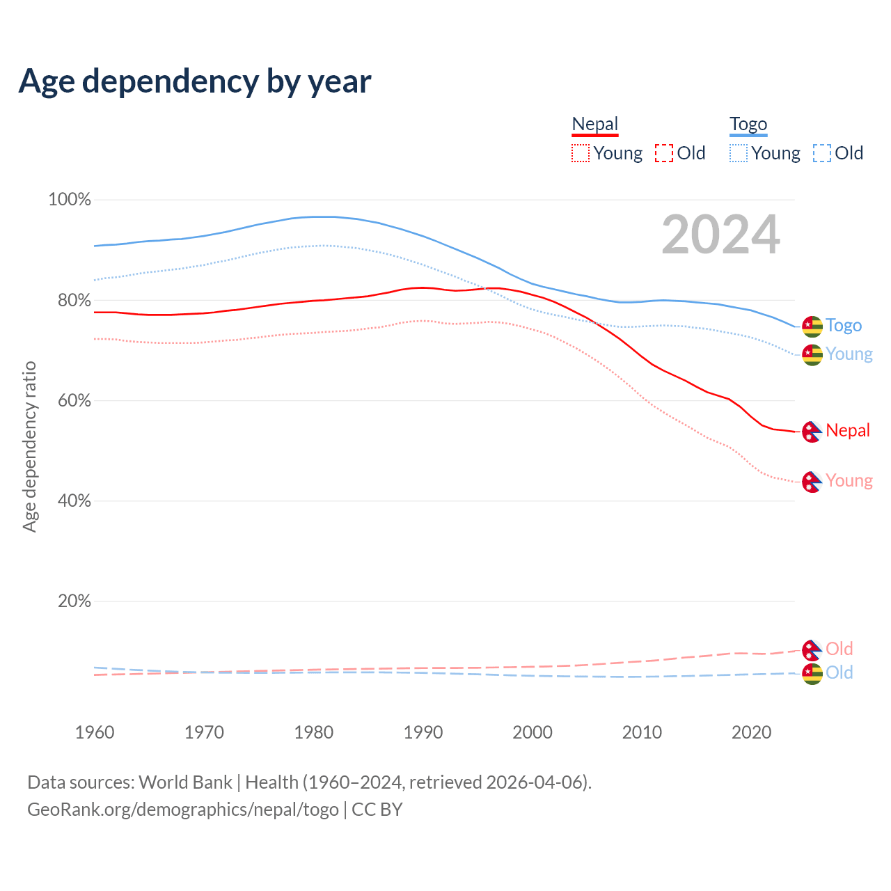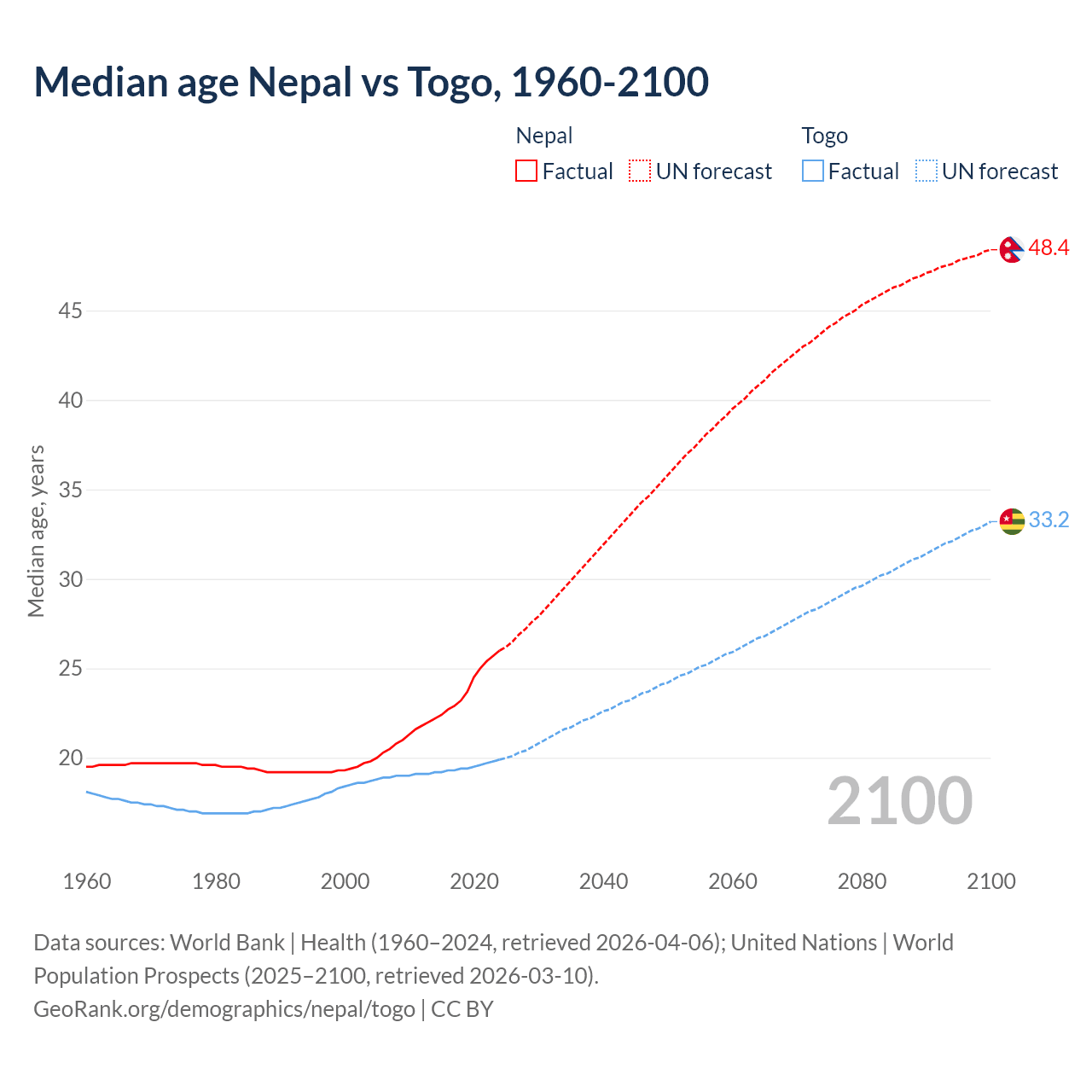 - Nepal is ranked 127/196 by median age (oldest to youngest) vs 166/196 for Togo.