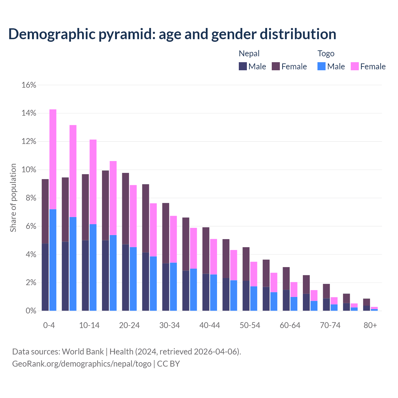 - As of 2026, the population of Nepal is 29.6M vs 9.99M in Togo - 2.96 times difference.