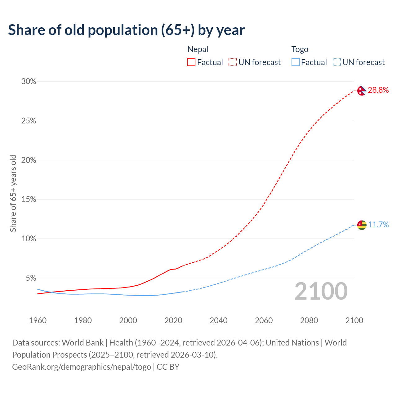 The share of older people aged 65 and over is 6.5% in Nepal and 3.21% in Togo. Life expectancy in Nepal compared to Togo .