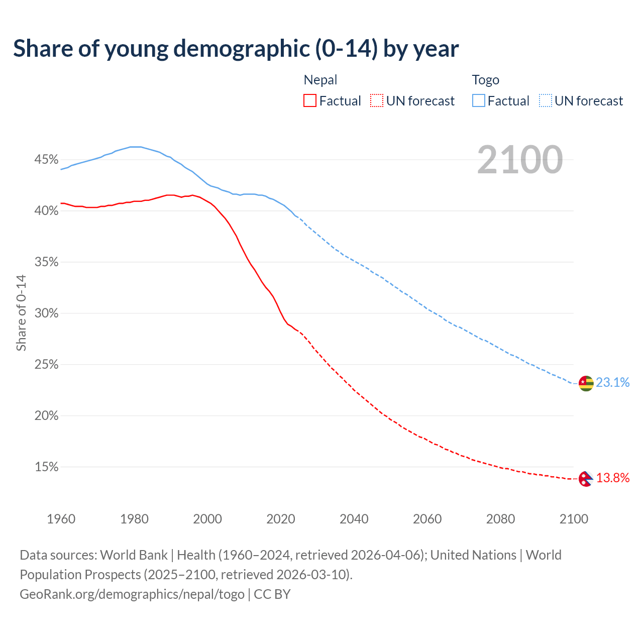 - The share of young demographic (0-15 years old) in Nepal is 28.4% vs 39.5% in Togo.