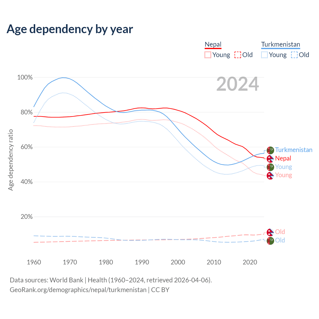Data sources: World Bank | Health (1960–2024, retrieved 2026-04-06); U.S. Census Bureau (1960–2024, retrieved 2026-02-08).