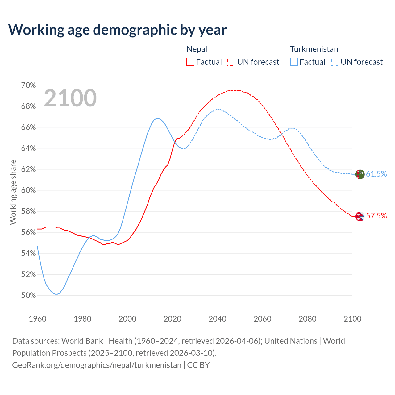 Median age Nepal vs Turkmenistan, 1960-2100