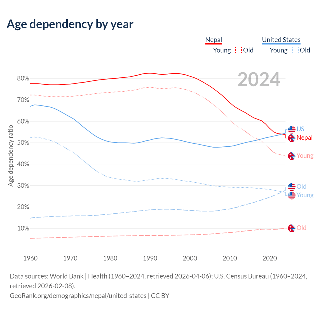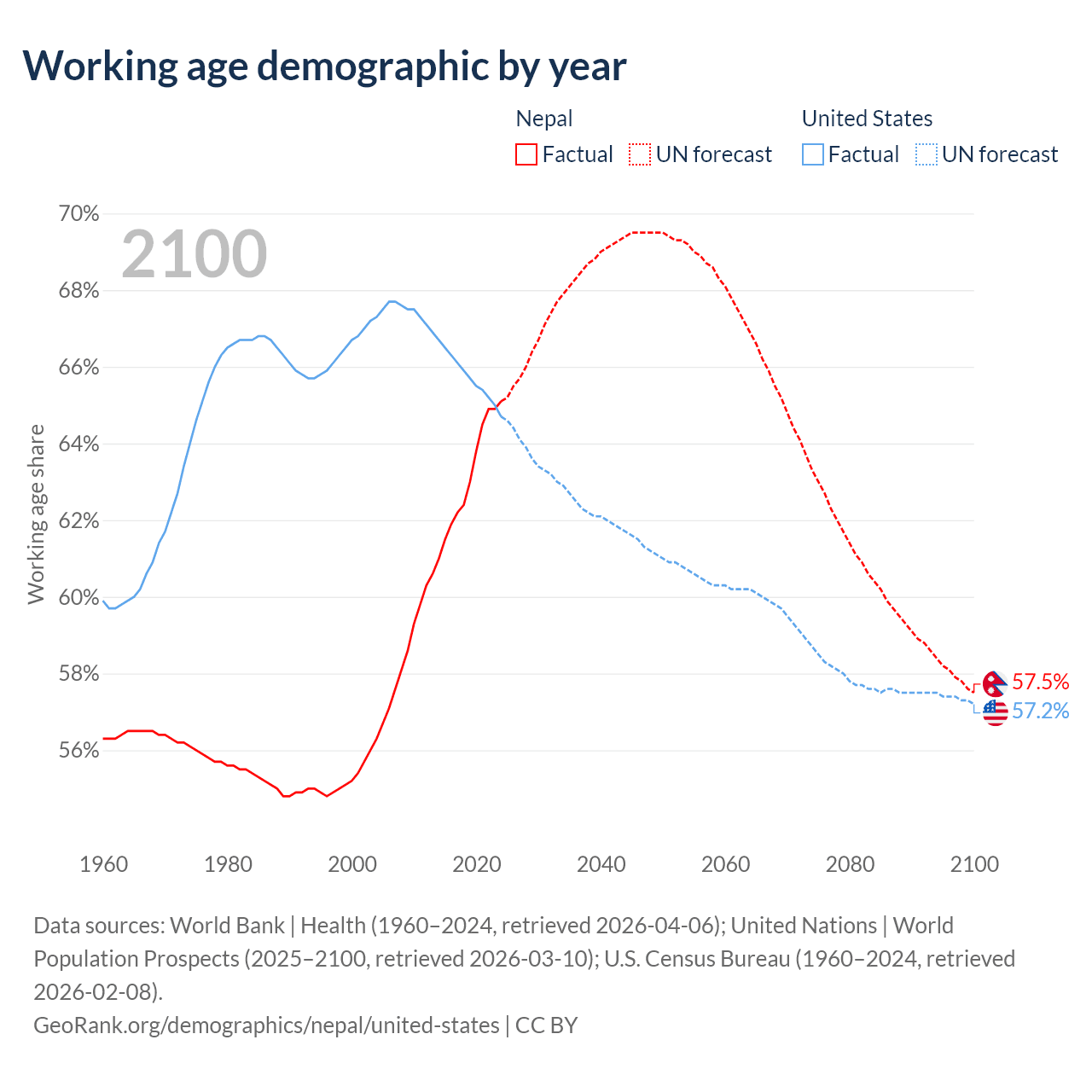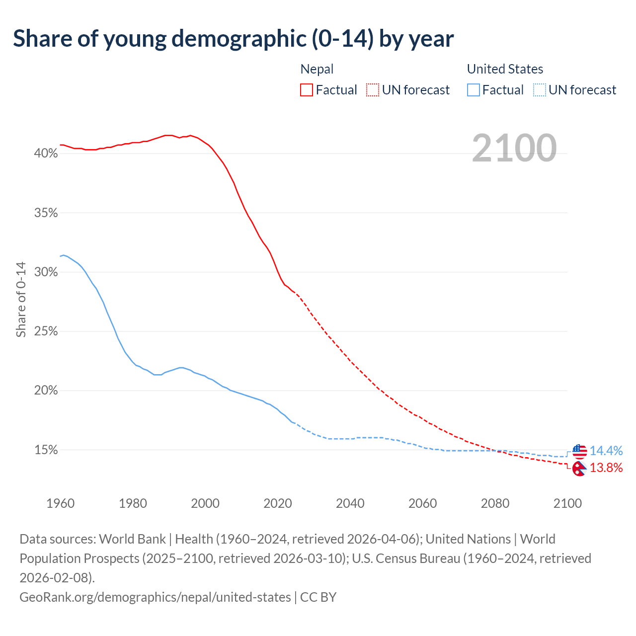 - The share of young demographic (0-15 years old) in Nepal is 28.4% vs 17.3% in the United States.