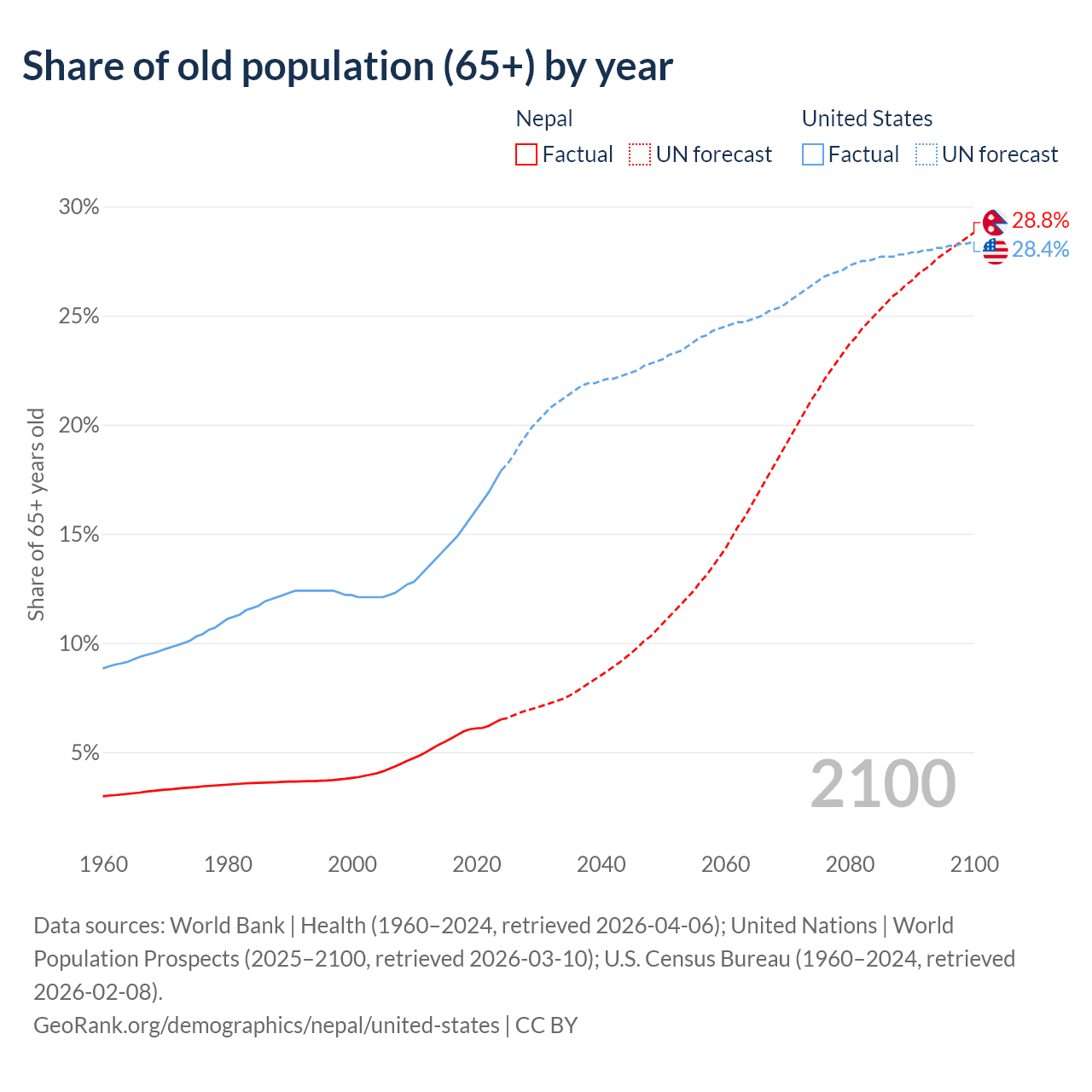 - The share of old-age demographic (65+) in Nepal is 6.5% vs 17.9% in the United States.