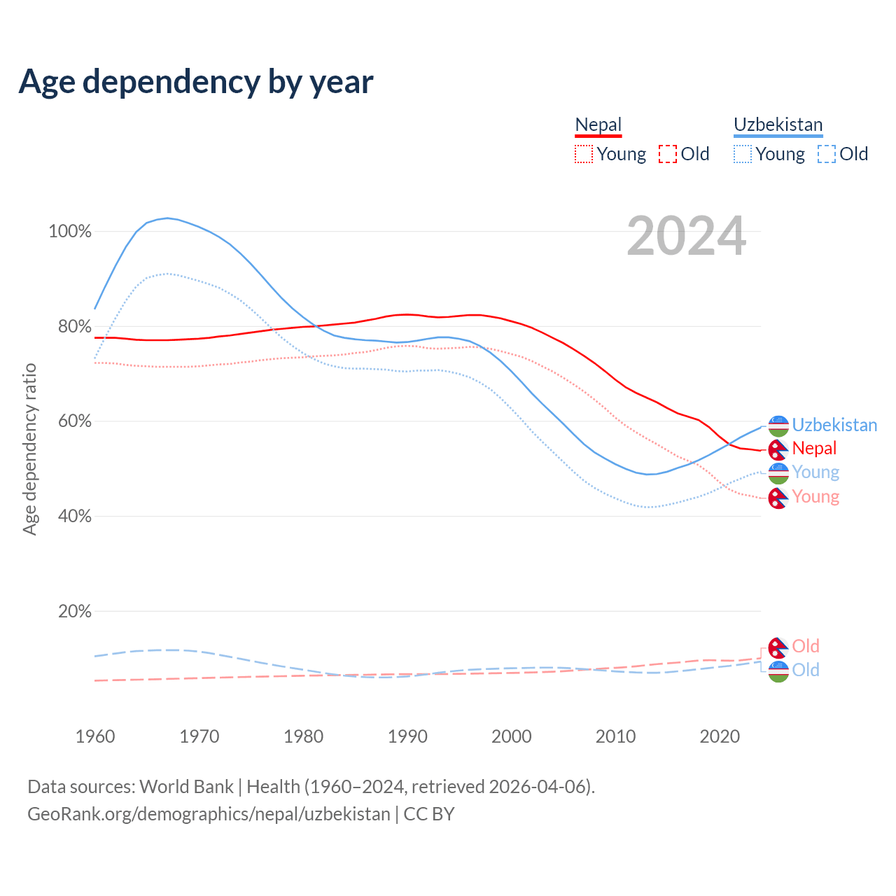 Data sources: World Bank | Health (1960–2024, retrieved 2026-04-06); U.S. Census Bureau (1960–2024, retrieved 2026-02-08).