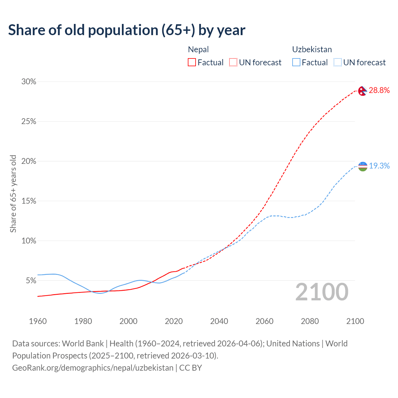The share of older people aged 65 and over is 6.5% in Nepal and 5.86% in Uzbekistan. Life expectancy in Nepal compared to Uzbekistan .