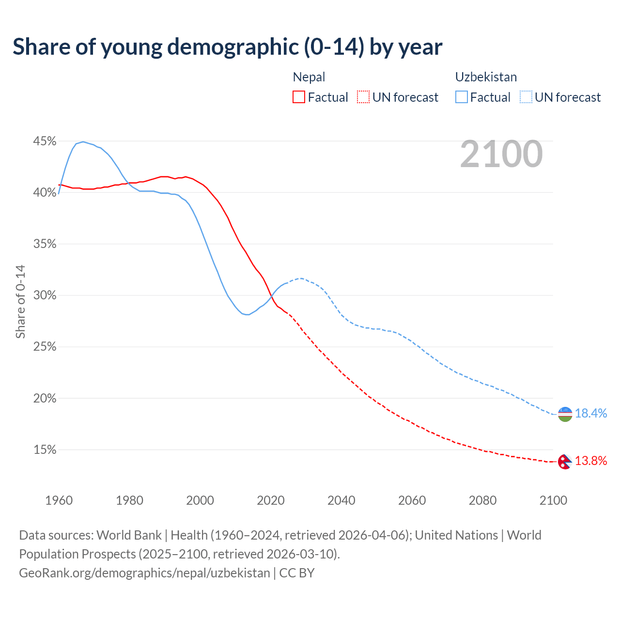 - The share of young demographic (0-15 years old) in Nepal is 28.4% vs 31.1% in Uzbekistan.