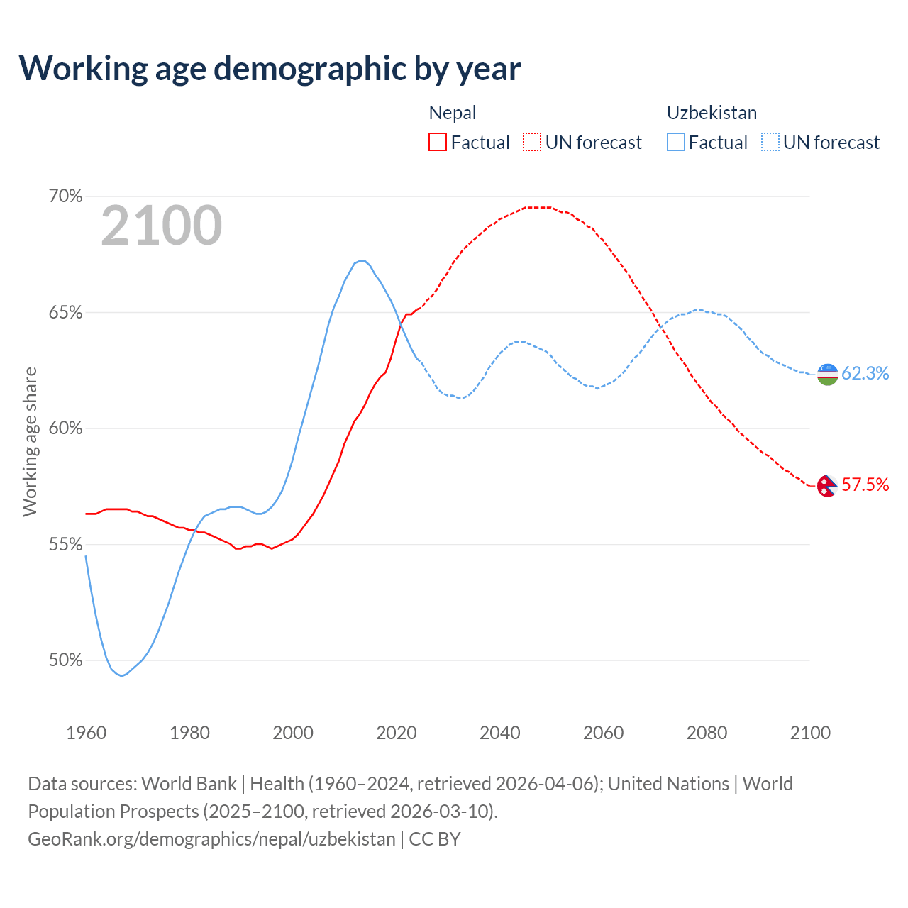 Median age Nepal vs Uzbekistan, 1960-2100