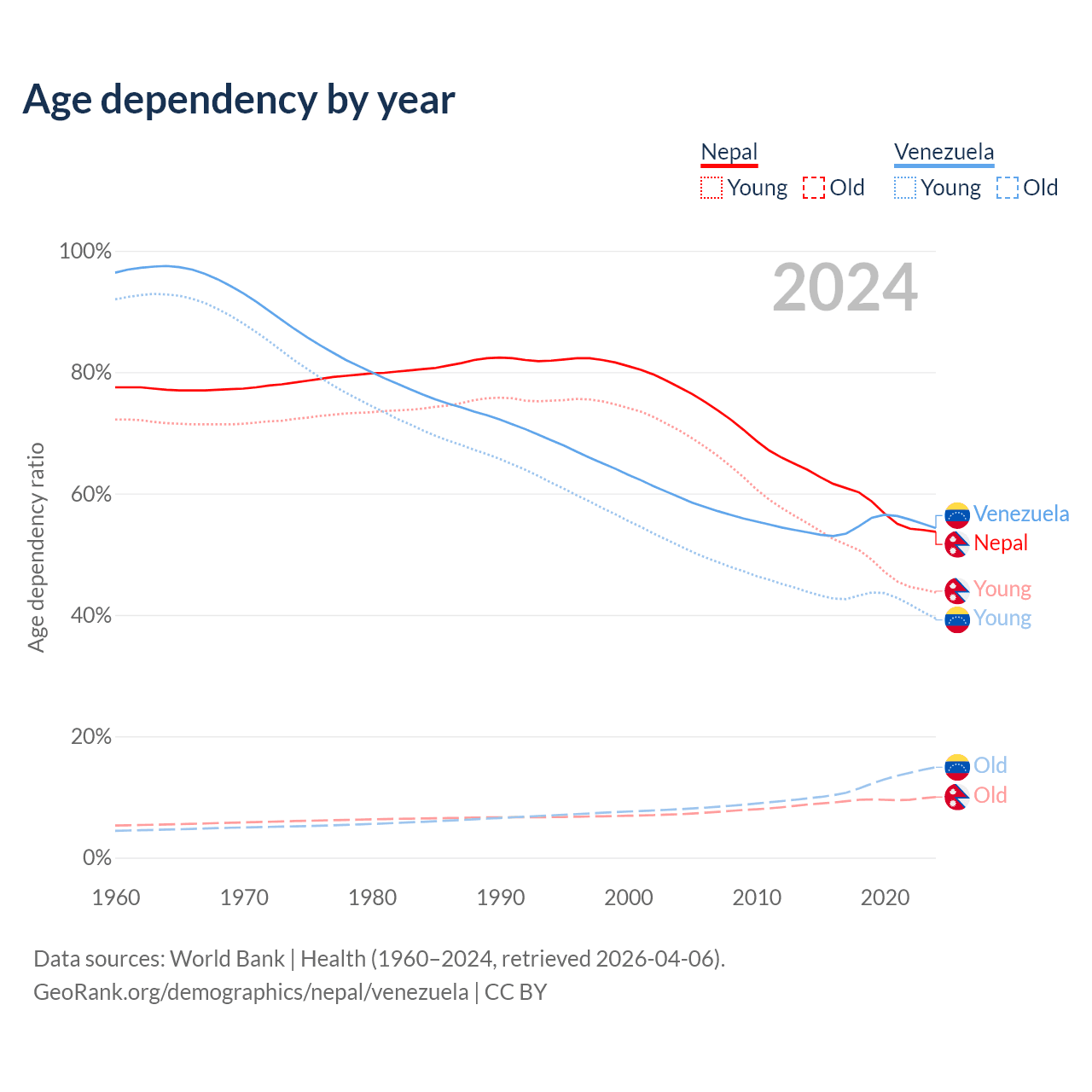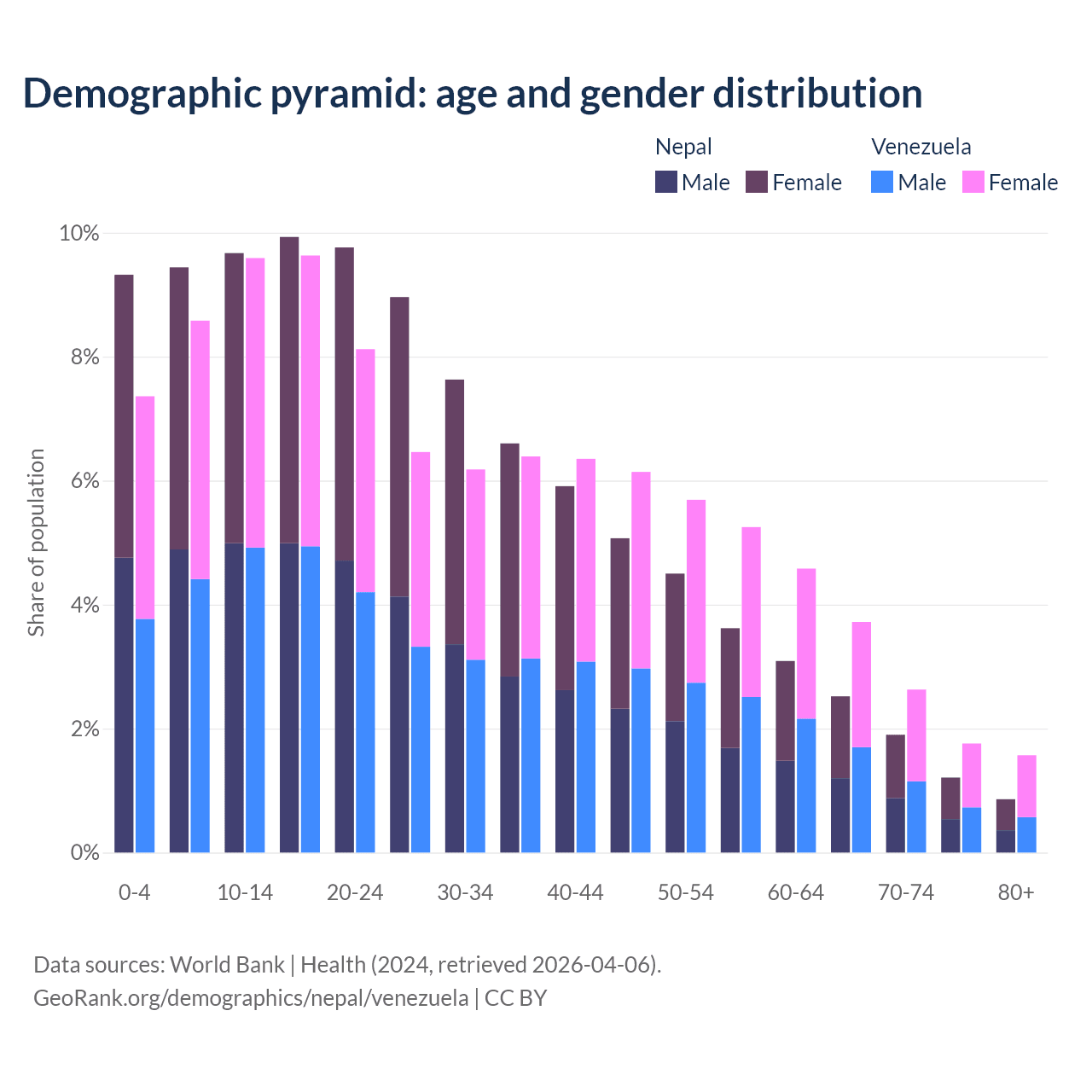 - Nepal is ranked 127/196 by median age (oldest to youngest) vs 104/196 for Venezuela.