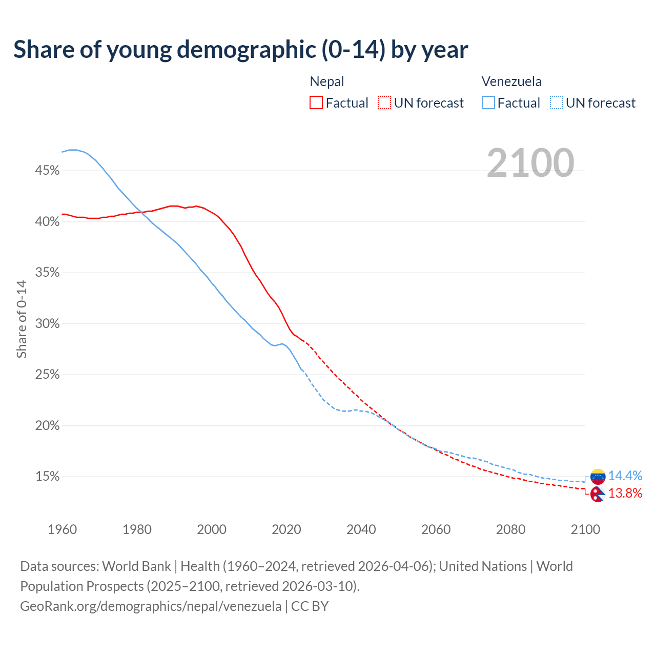 - The share of young demographic (0-15 years old) in Nepal is 28.4% vs 25.5% in Venezuela.