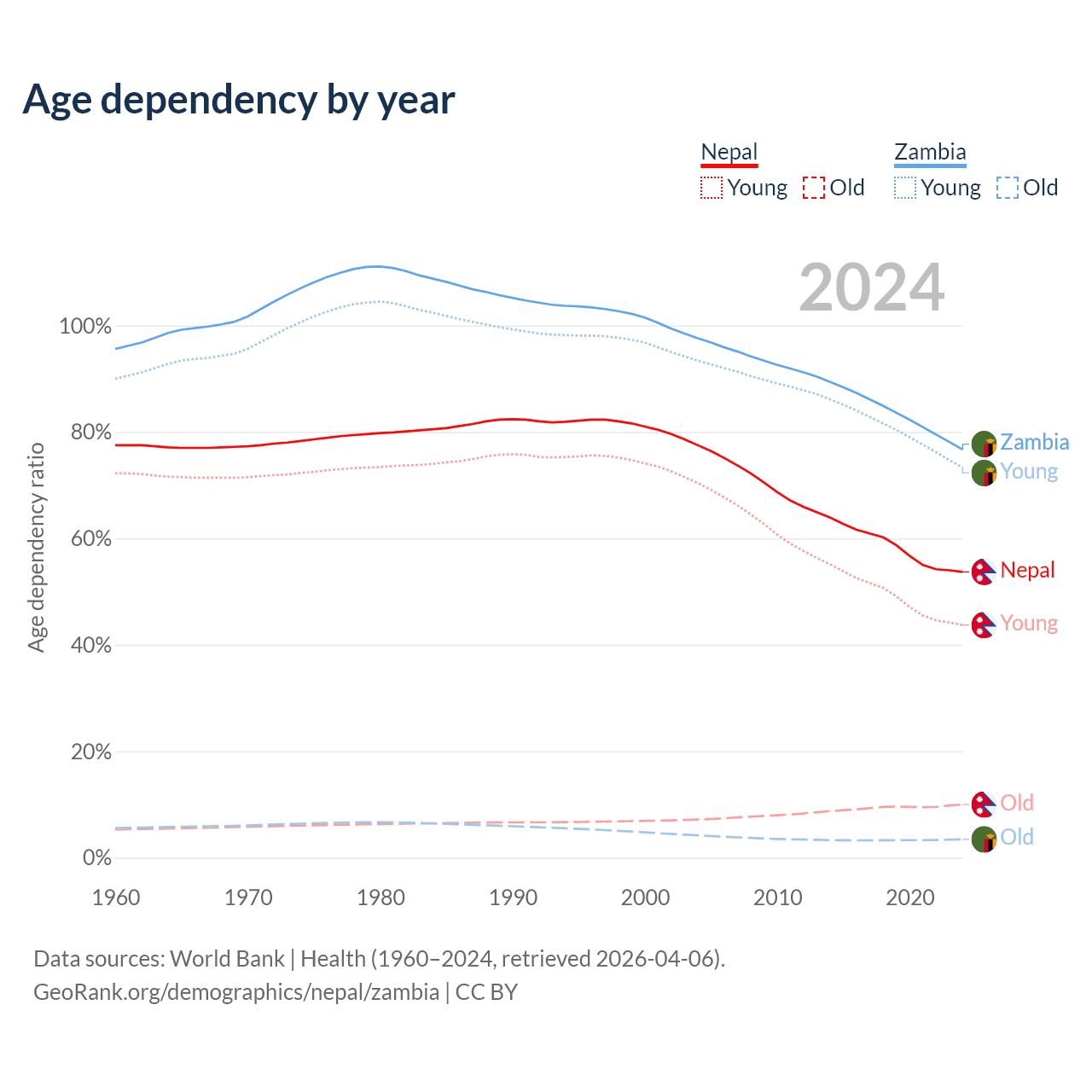 Data sources: World Bank | Health (1960–2024, retrieved 2026-04-06); U.S. Census Bureau (1960–2024, retrieved 2026-02-08).