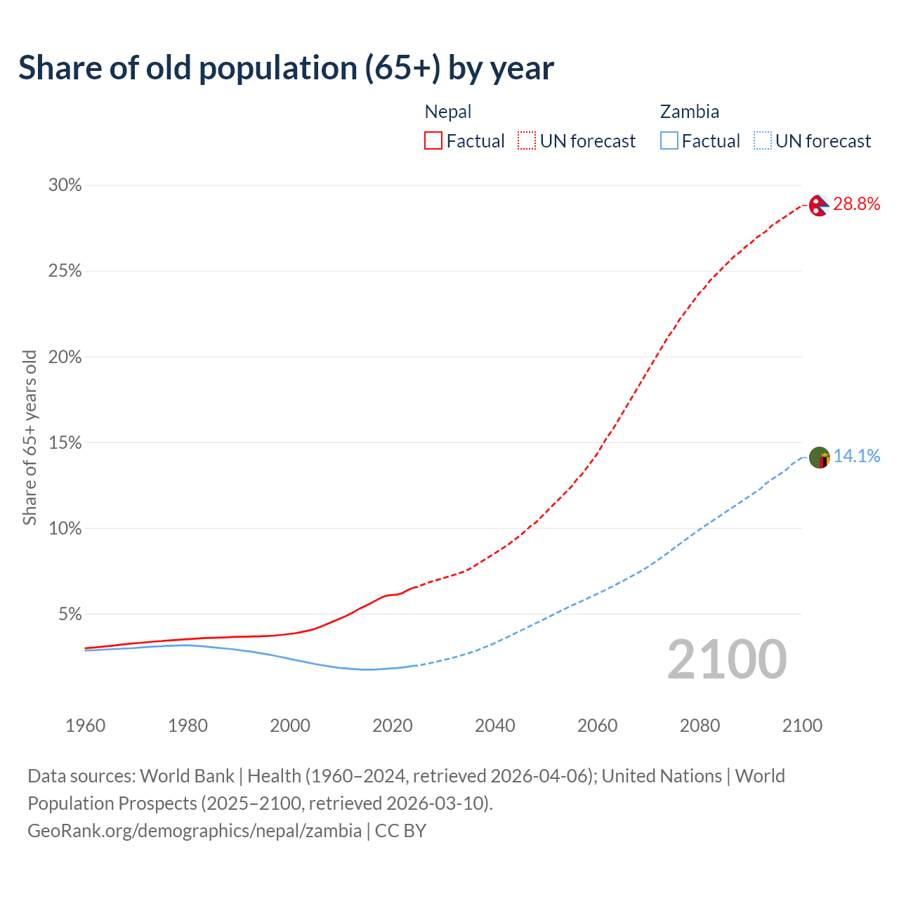 The share of older people aged 65 and over is 6.5% in Nepal and 1.95% in Zambia. Life expectancy in Nepal compared to Zambia .