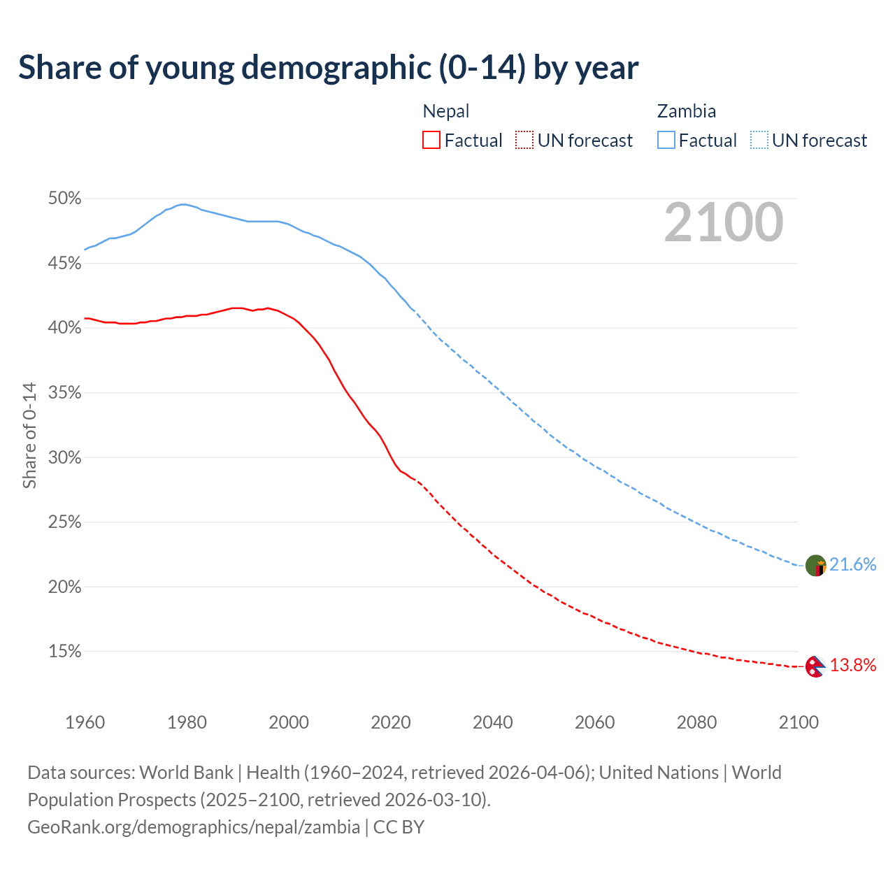- The share of young demographic (0-15 years old) in Nepal is 28.4% vs 41.5% in Zambia.