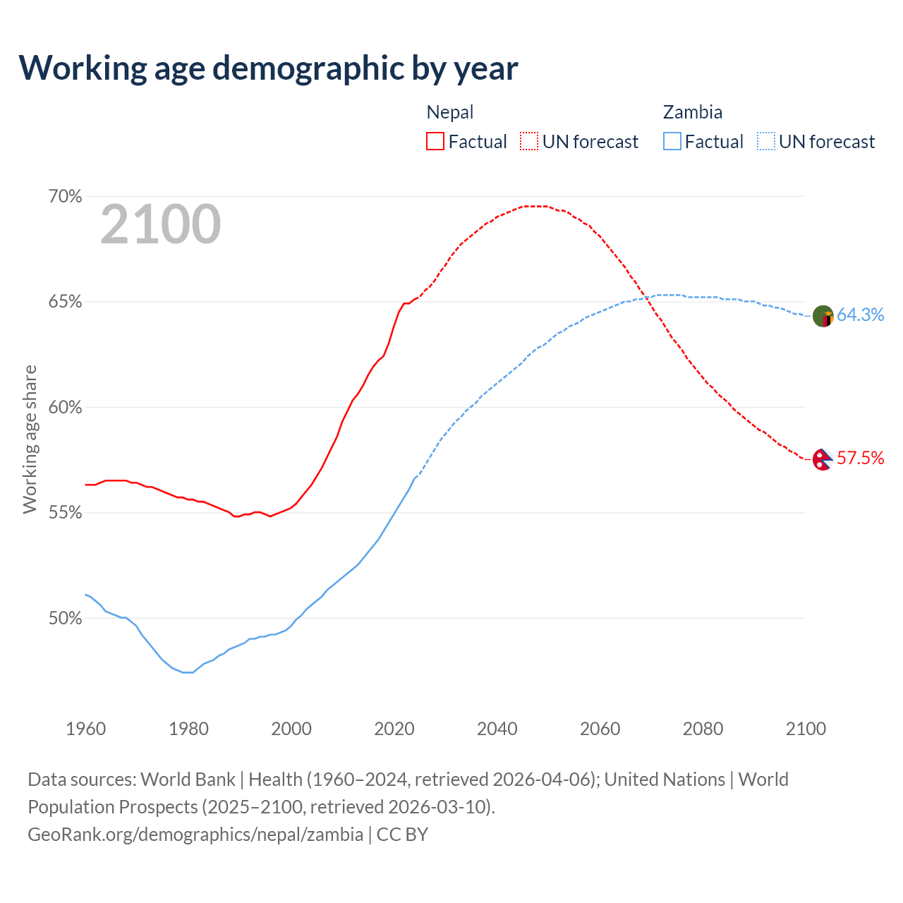 Median age Nepal vs Zambia, 1960-2100
