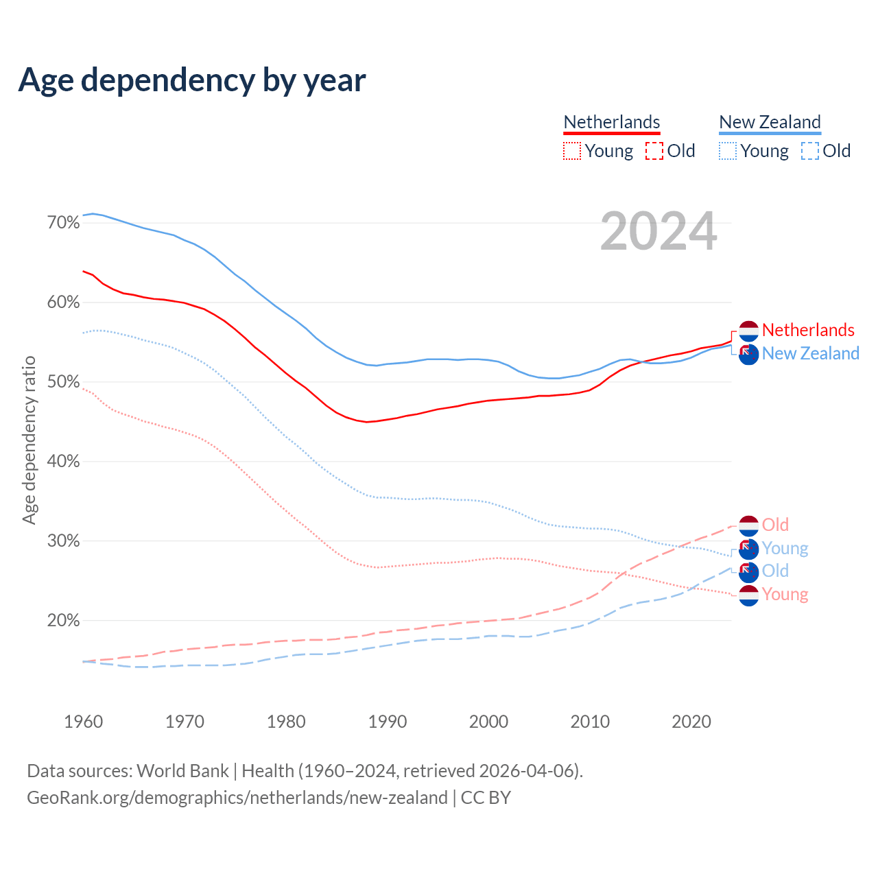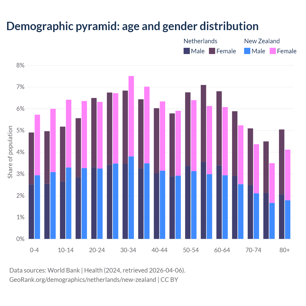 - The Netherlands is ranked 33/196 by median age (oldest to youngest) vs 56/196 for New Zealand.