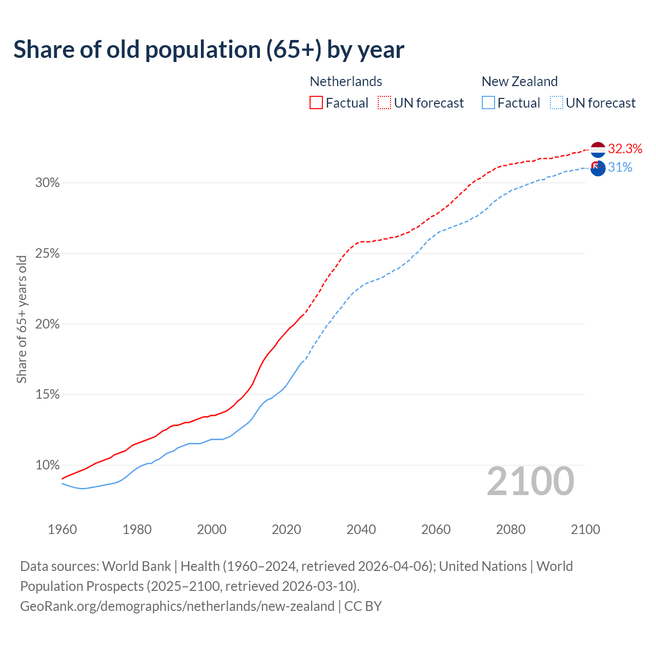- The share of old-age demographic (65+) in the Netherlands is 20.5% vs 17.2% in New Zealand.