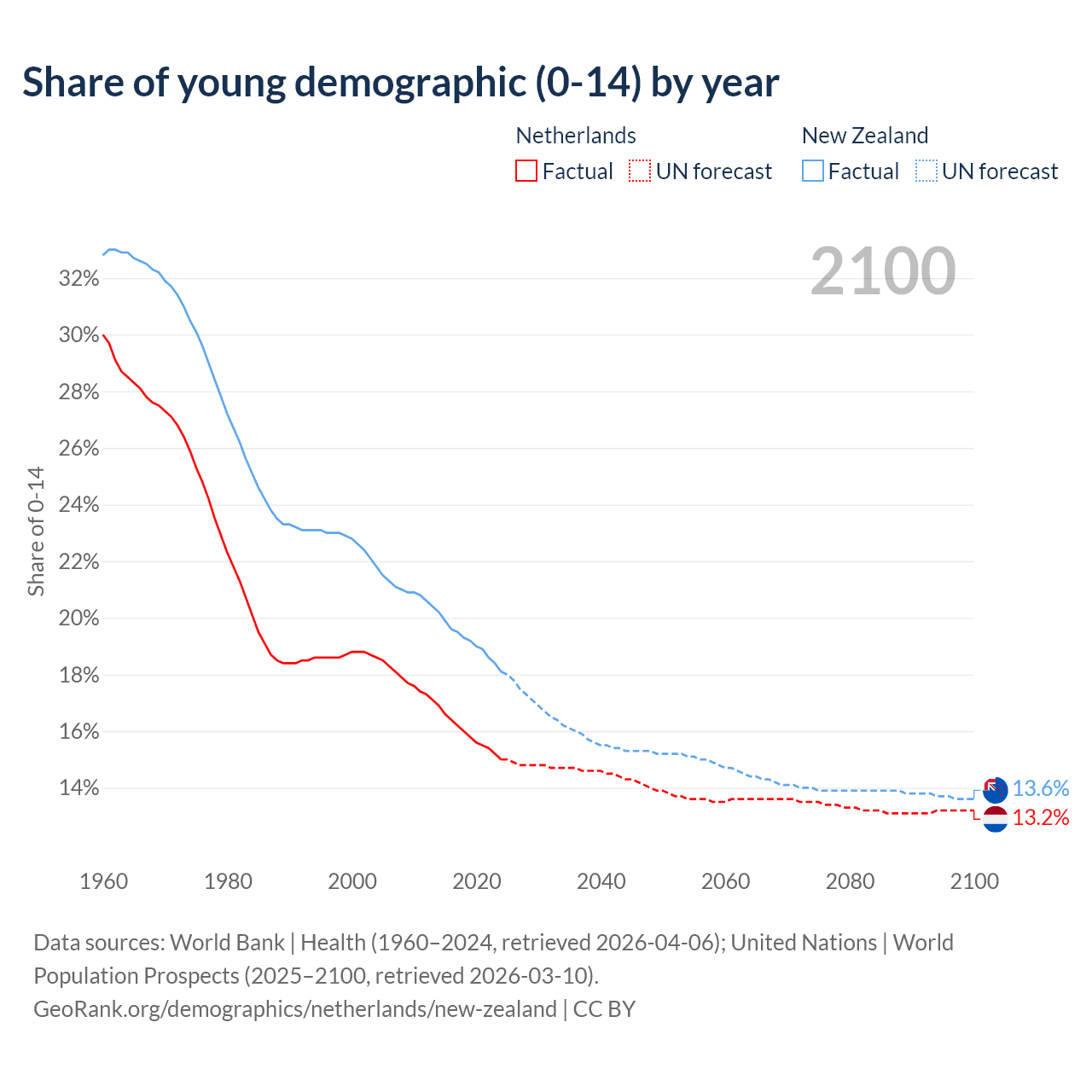 - The share of young demographic (0-15 years old) in the Netherlands is 15% vs 18.1% in New Zealand.