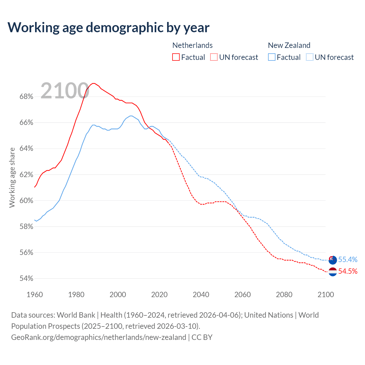 - The Netherlands has 11.8M working age adults (aged 15-64) vs 3.48M in New Zealand.
