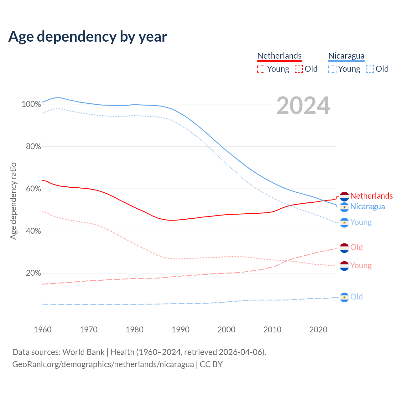 - The Netherlands is ranked 33/196 by median age (oldest to youngest) vs 125/196 for Nicaragua.