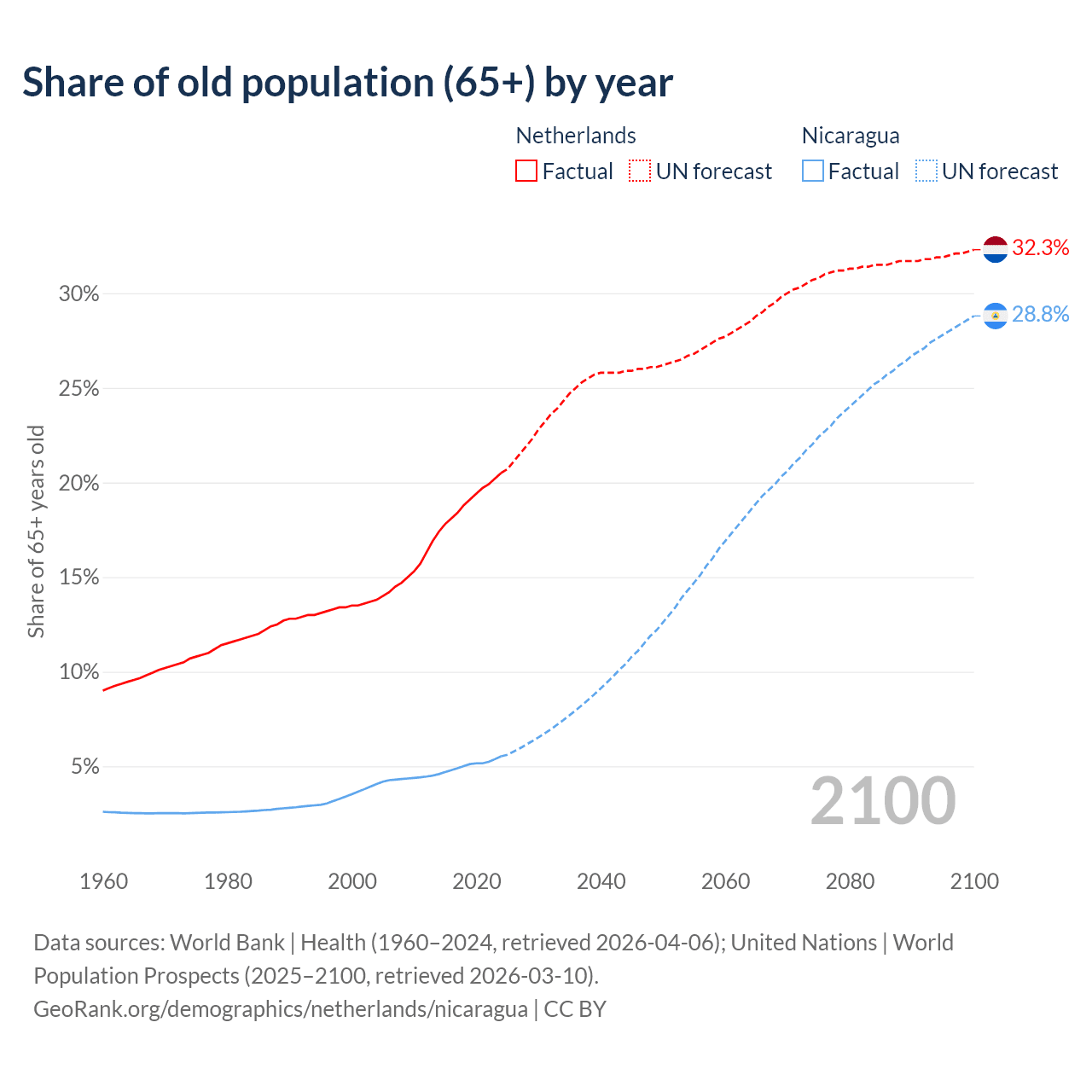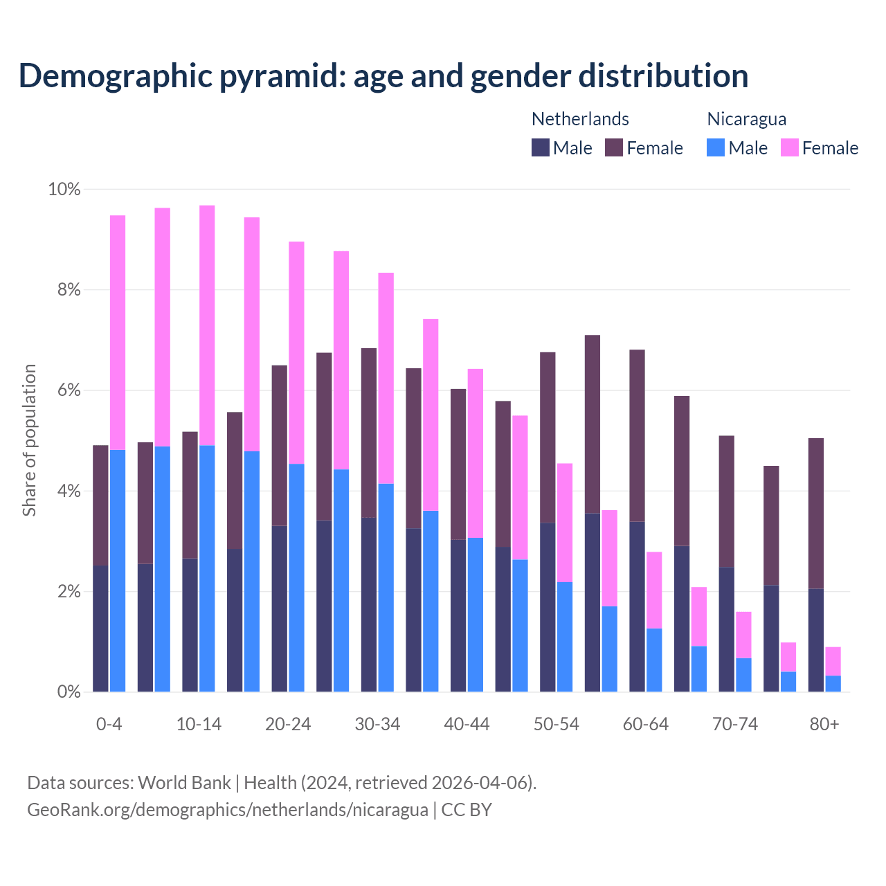 - The share of old-age demographic (65+) in the Netherlands is 20.5% vs 5.53% in Nicaragua.