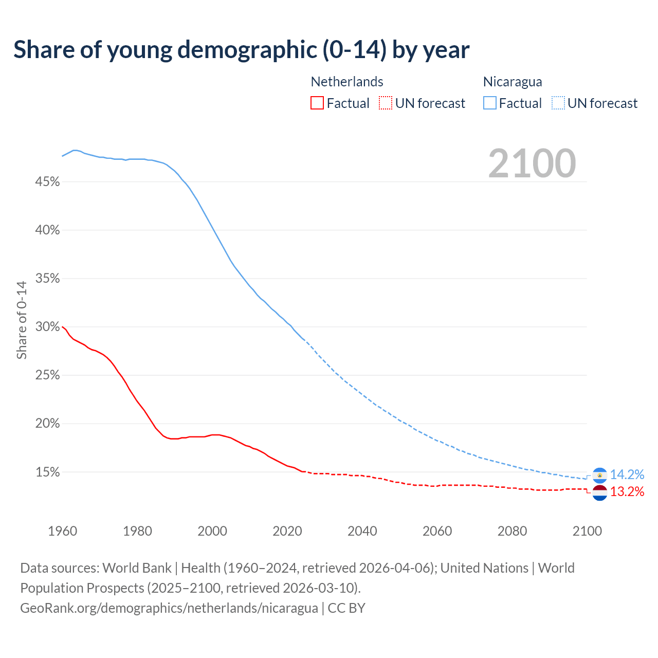 - The share of young demographic (0-15 years old) in the Netherlands is 15% vs 28.8% in Nicaragua.