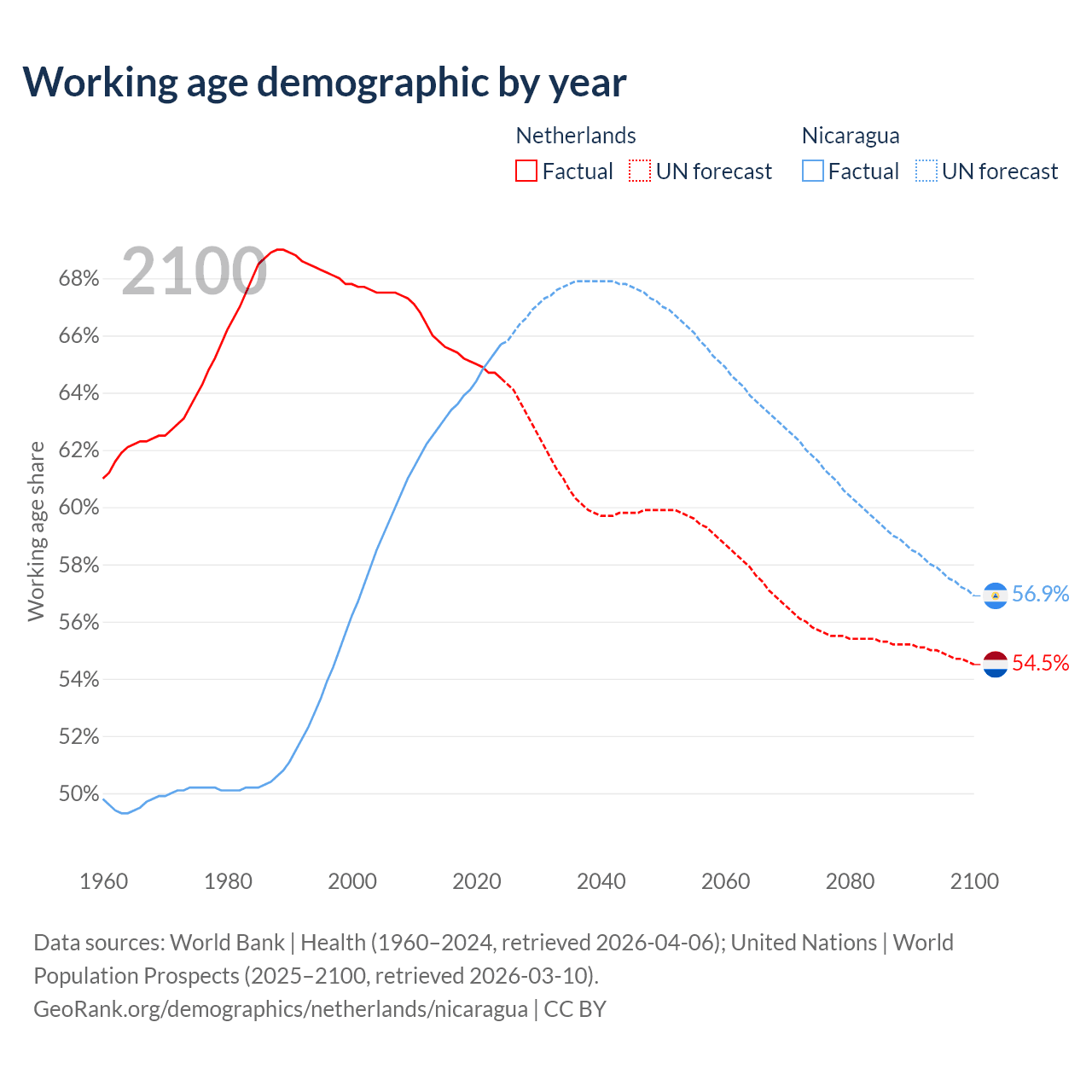 Median age Netherlands vs Nicaragua, 1960-2100