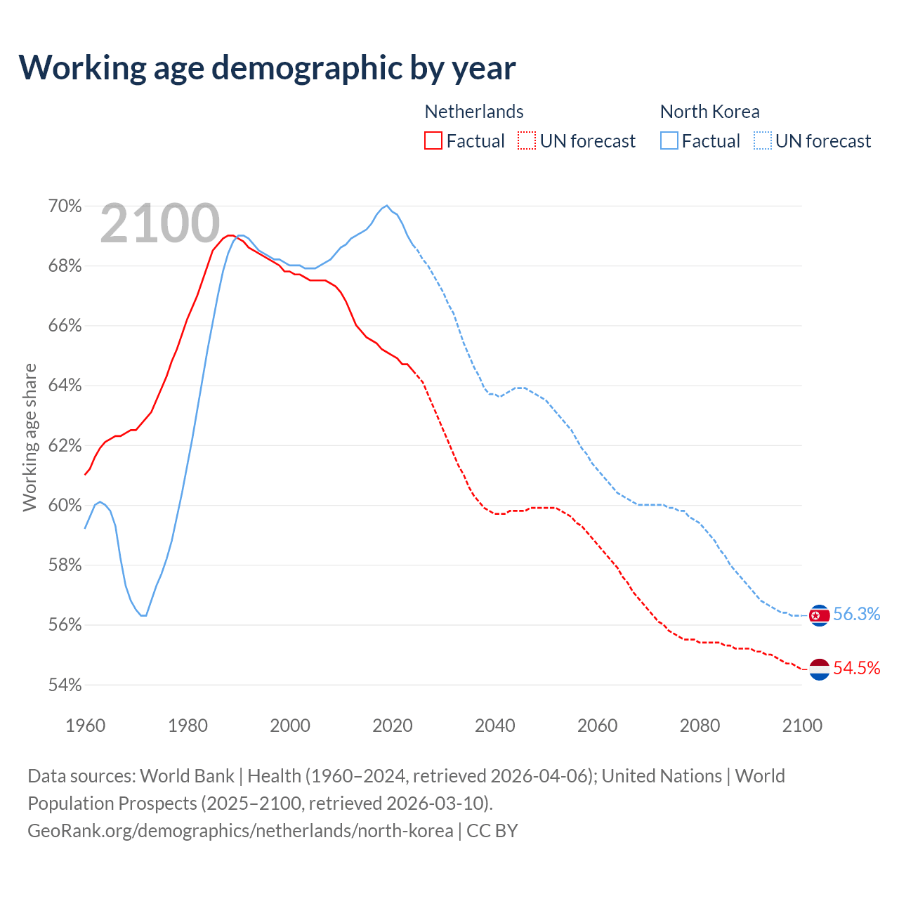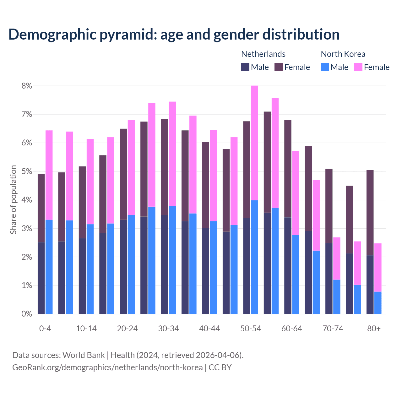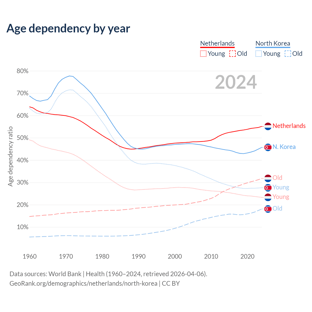 - The share of old-age demographic (65+) in the Netherlands is 20.5% vs 12.4% in North Korea.
