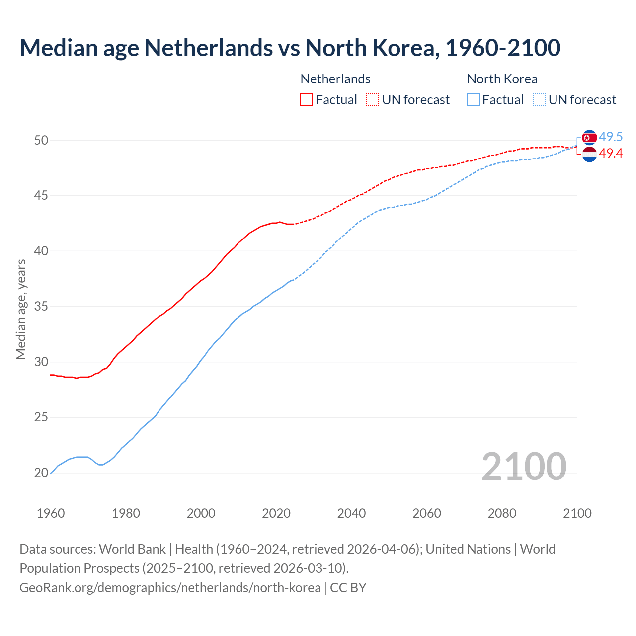 Median age Netherlands vs North Korea, 1960-2100
