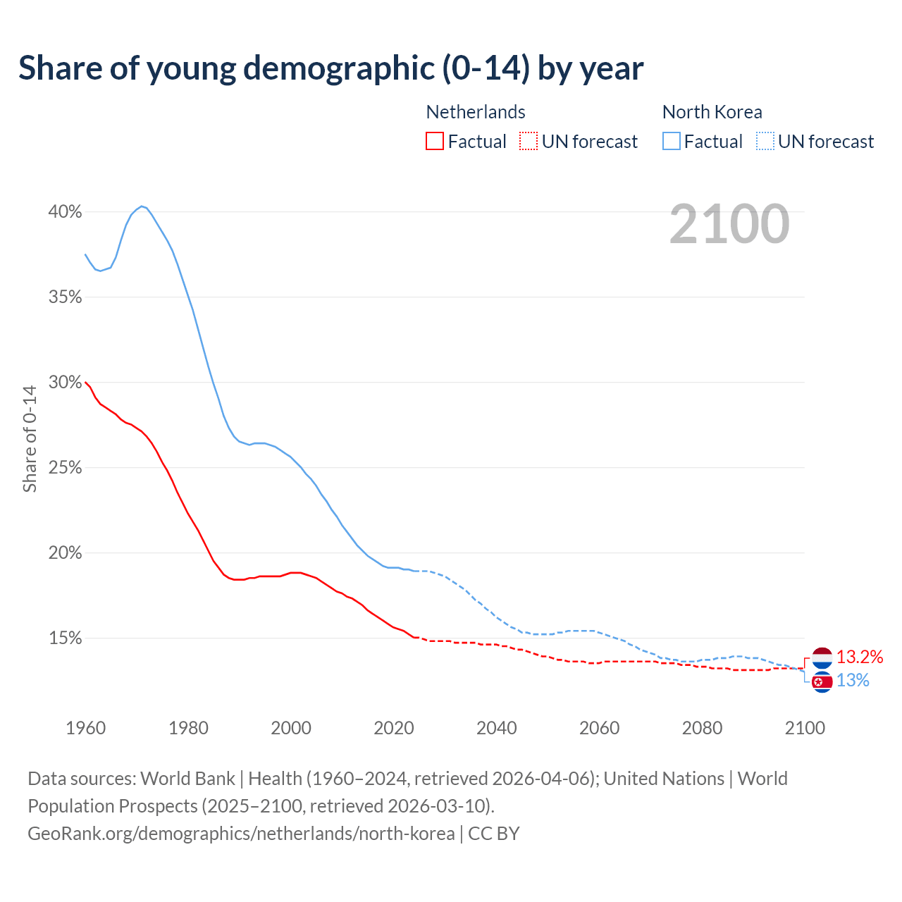 - The share of young demographic (0-15 years old) in the Netherlands is 15% vs 18.9% in North Korea.