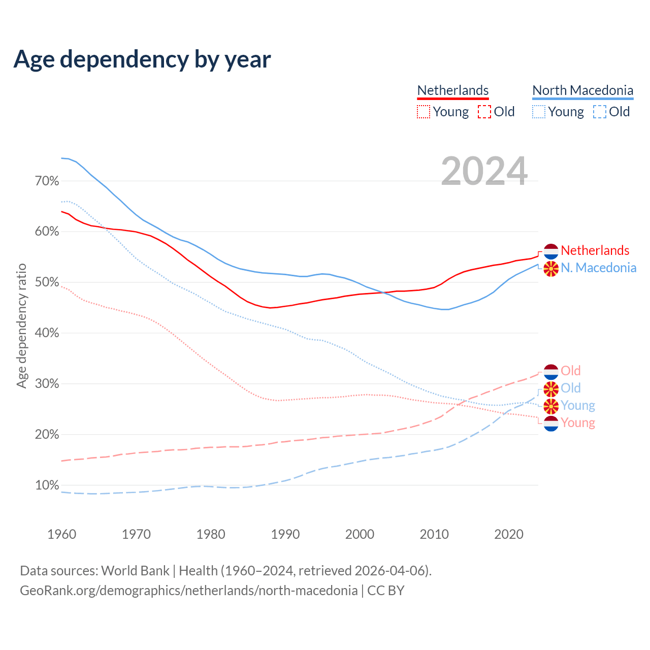- The Netherlands is ranked 33/196 by median age (oldest to youngest) vs 37/196 for North Macedonia.