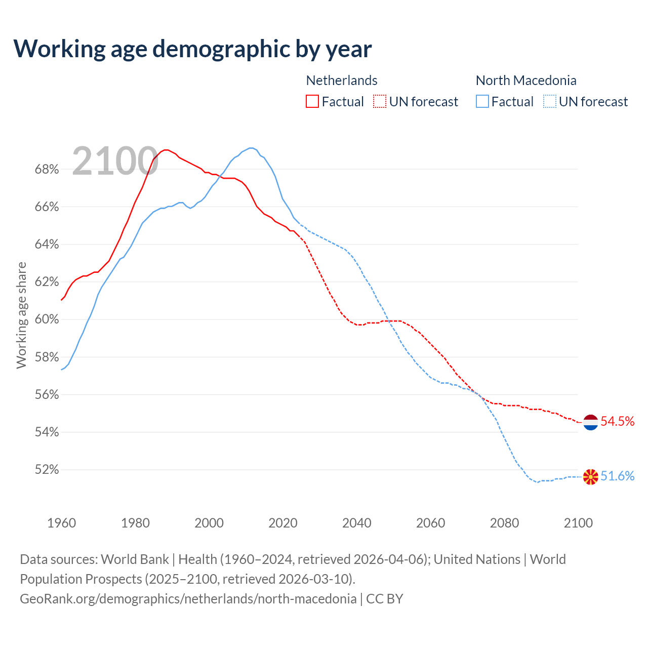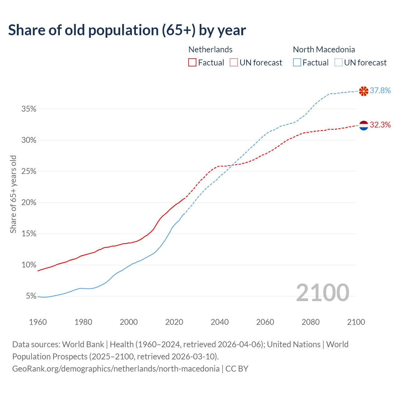 Median age Netherlands vs North Macedonia, 1960-2100