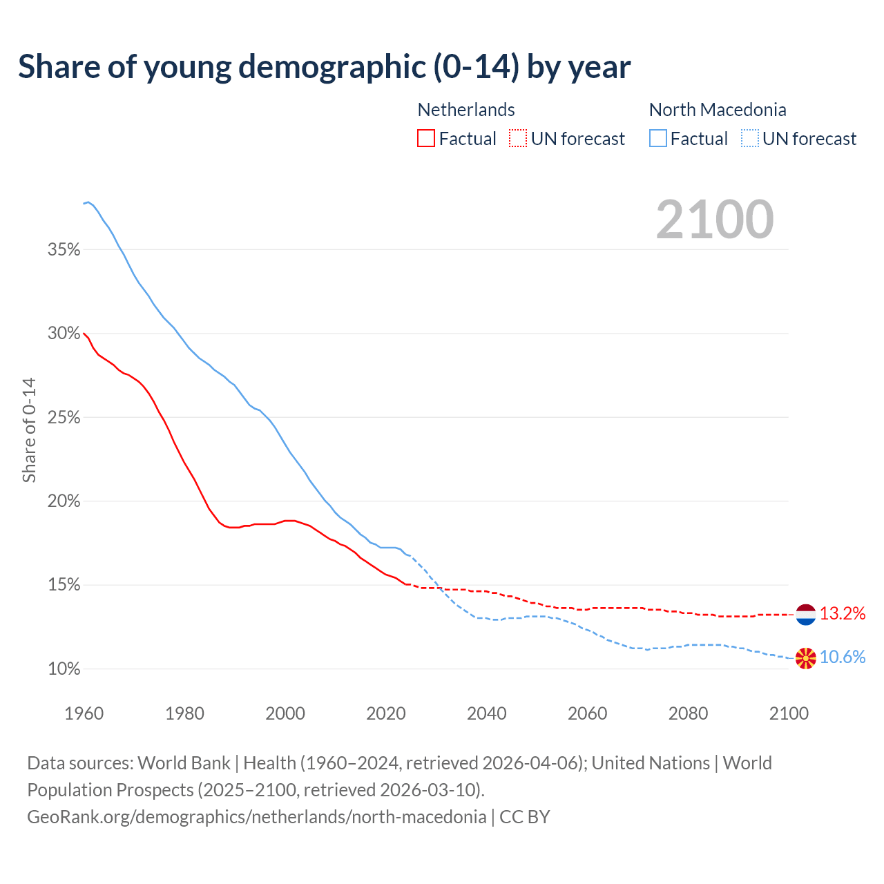 - The share of young demographic (0-15 years old) in the Netherlands is 15% vs 16.8% in North Macedonia.