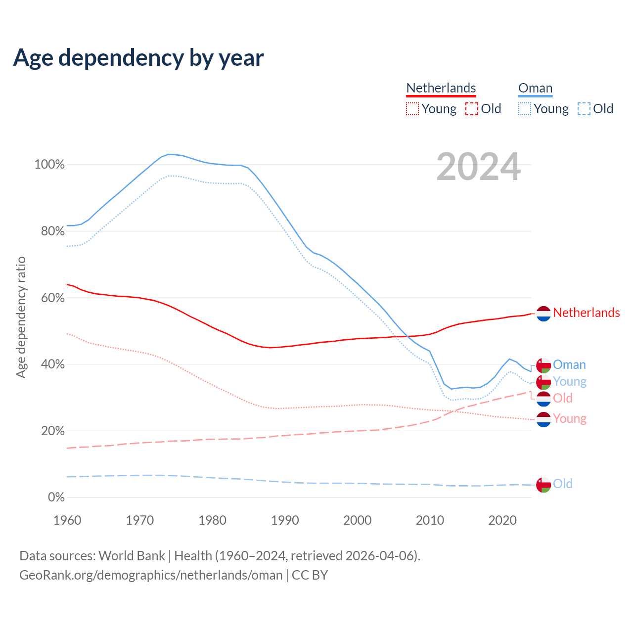- The Netherlands is ranked 33/196 by median age (oldest to youngest) vs 101/196 for Oman.