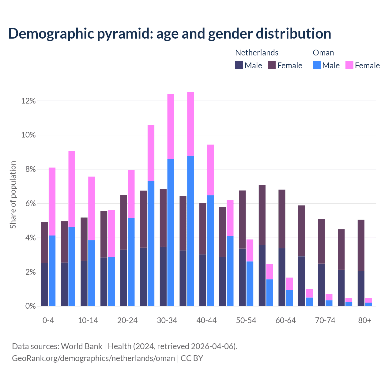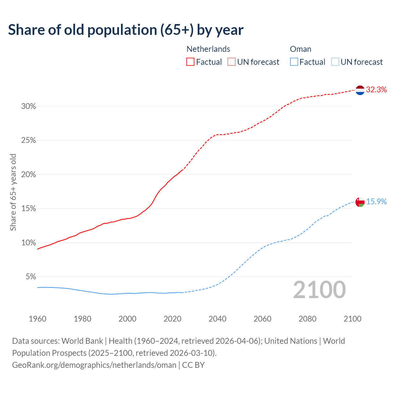 The share of older people aged 65 and over is 20.5% in the Netherlands and 2.64% in Oman. Life expectancy in the Netherlands compared to Oman .