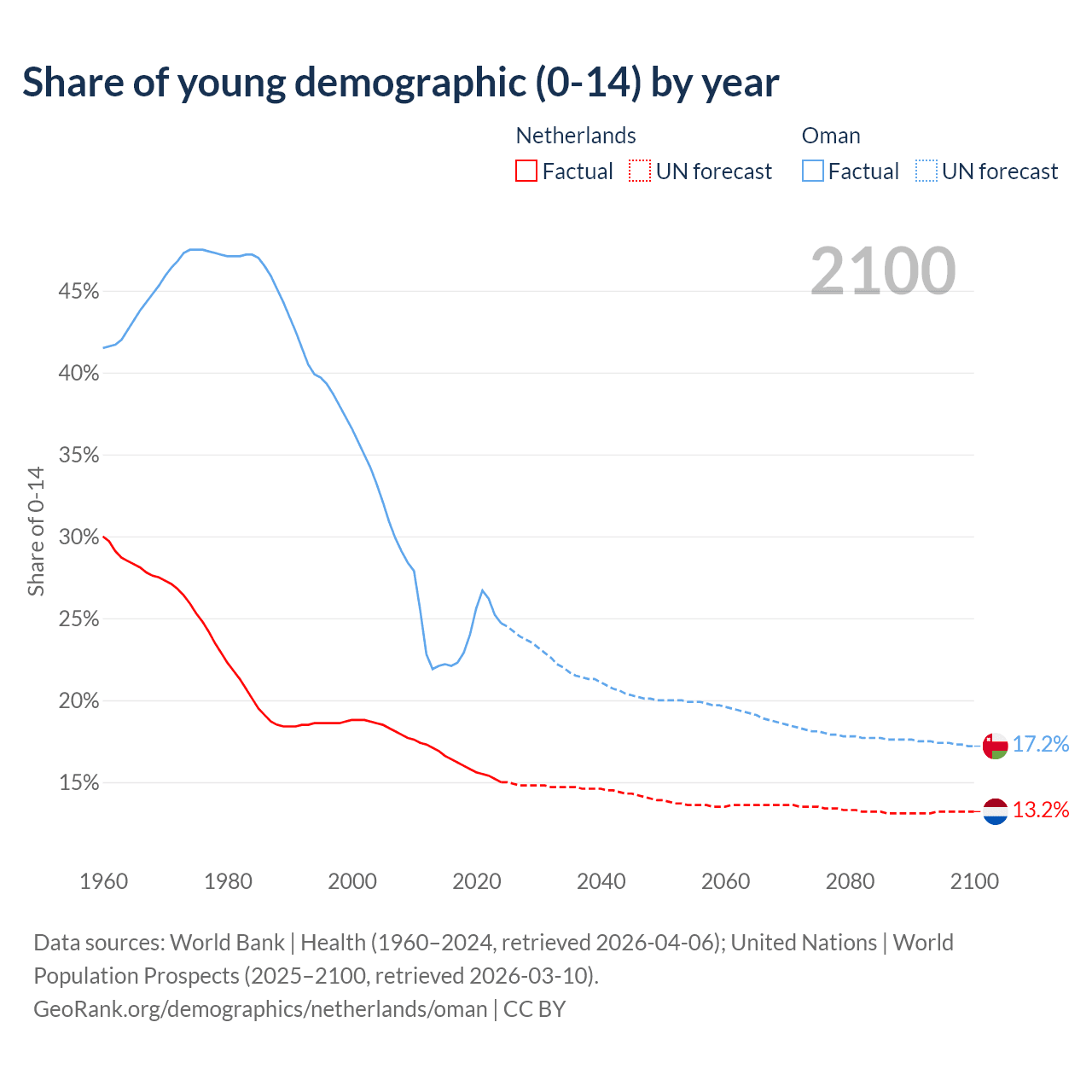 - The share of young demographic (0-15 years old) in the Netherlands is 15% vs 24.7% in Oman.