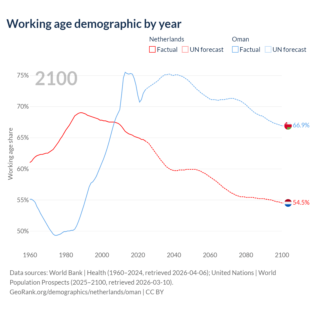 Median age Netherlands vs Oman, 1960-2100