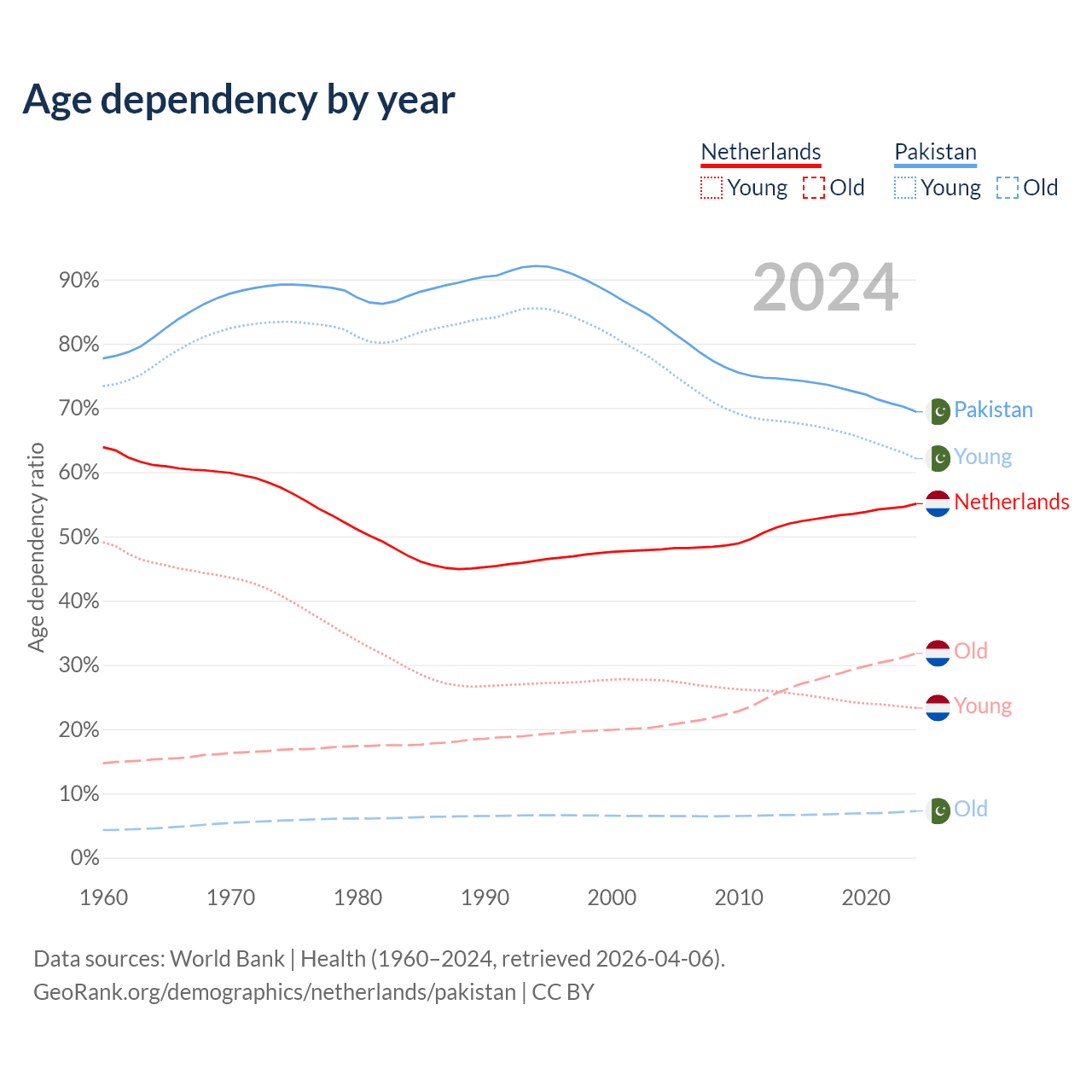 - The Netherlands is ranked 33/196 by median age (oldest to youngest) vs 154/196 for Pakistan.