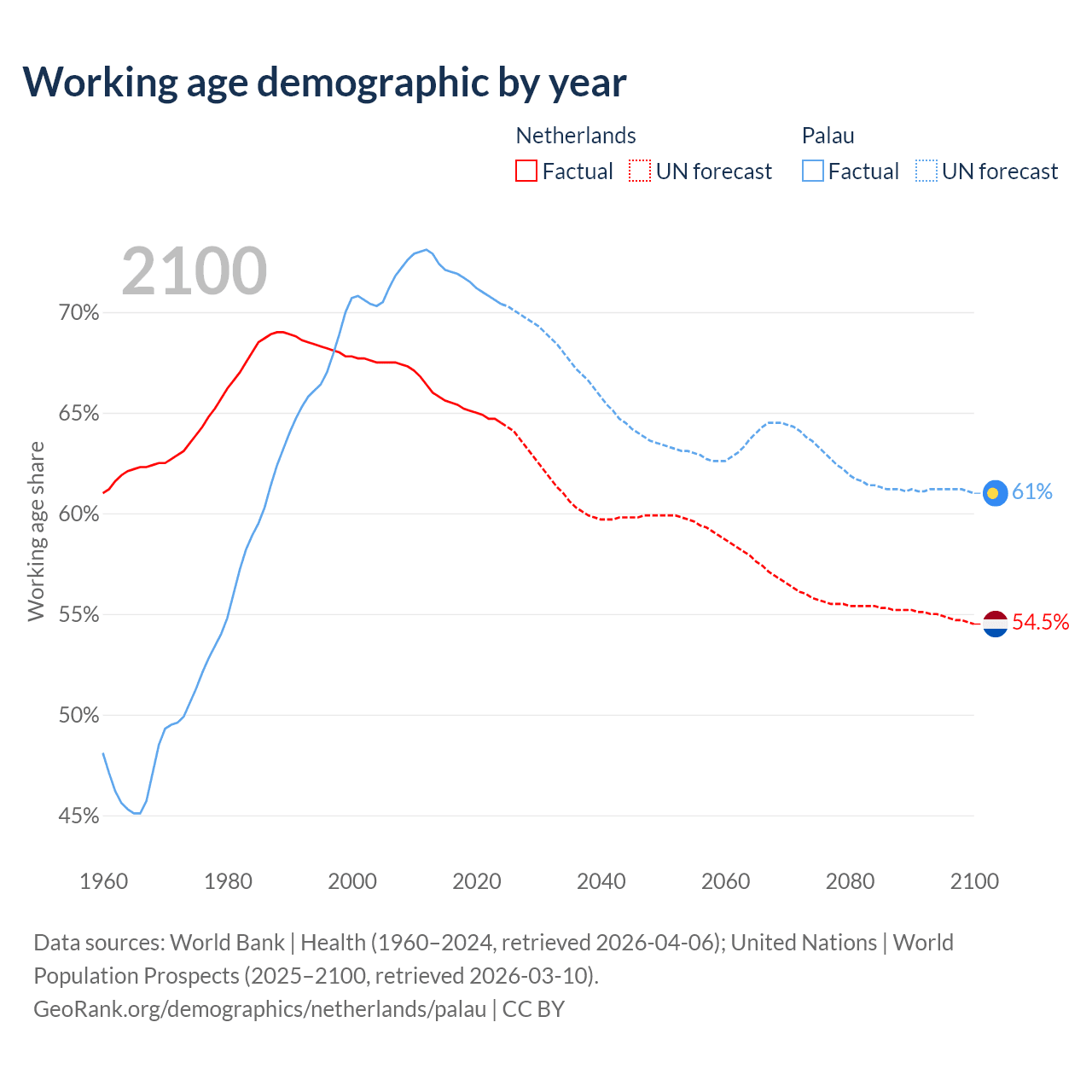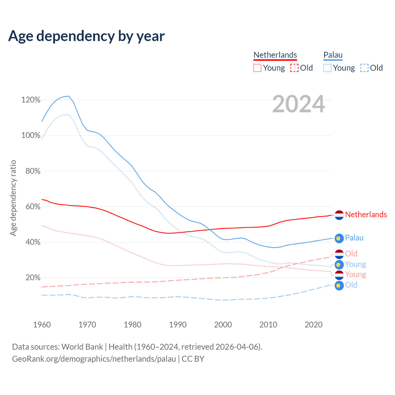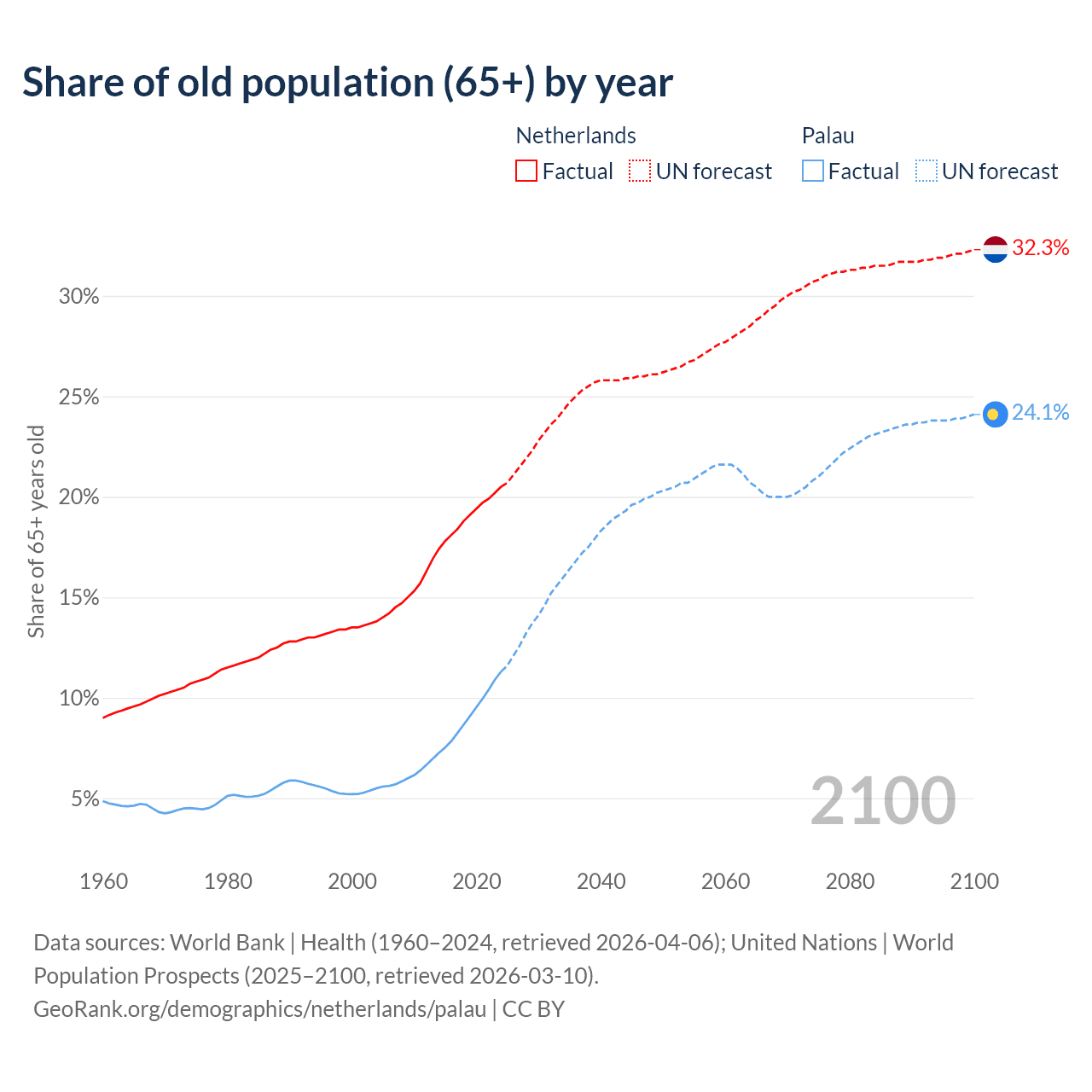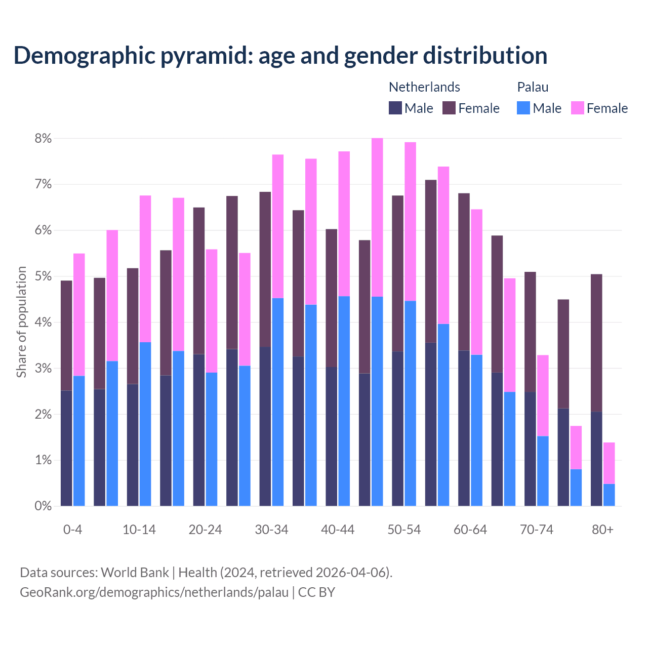 - The share of old-age demographic (65+) in the Netherlands is 20.5% vs 11.3% in Palau.