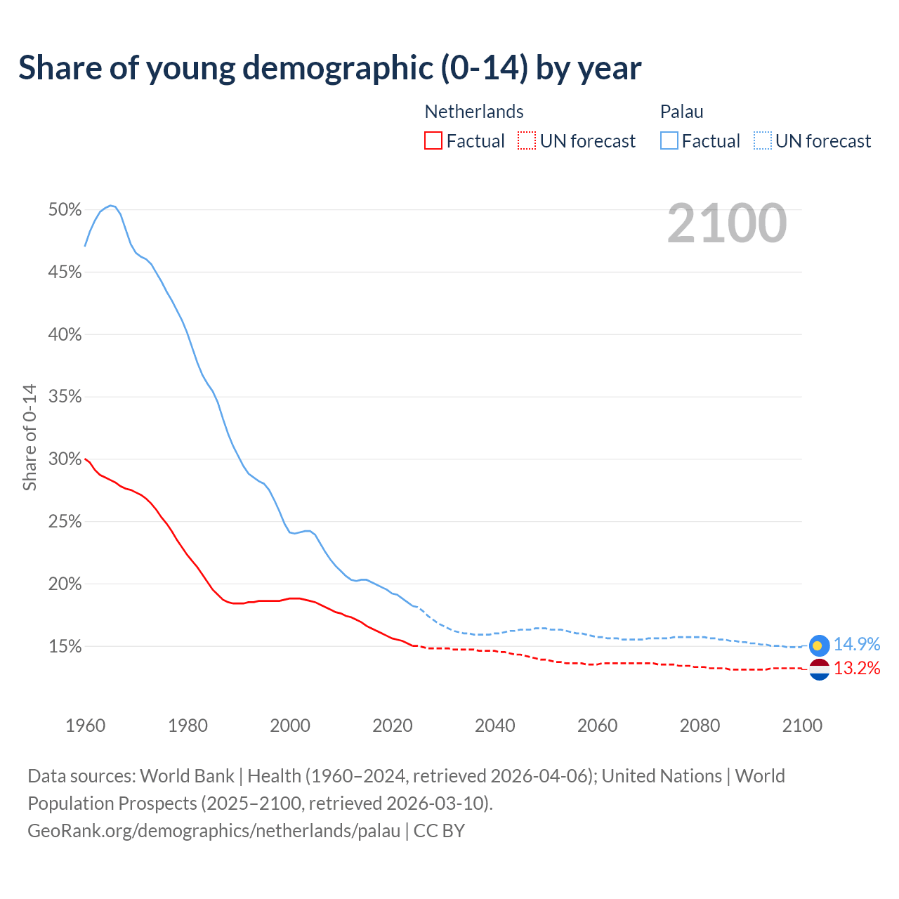 - The share of young demographic (0-15 years old) in the Netherlands is 15% vs 18.2% in Palau.