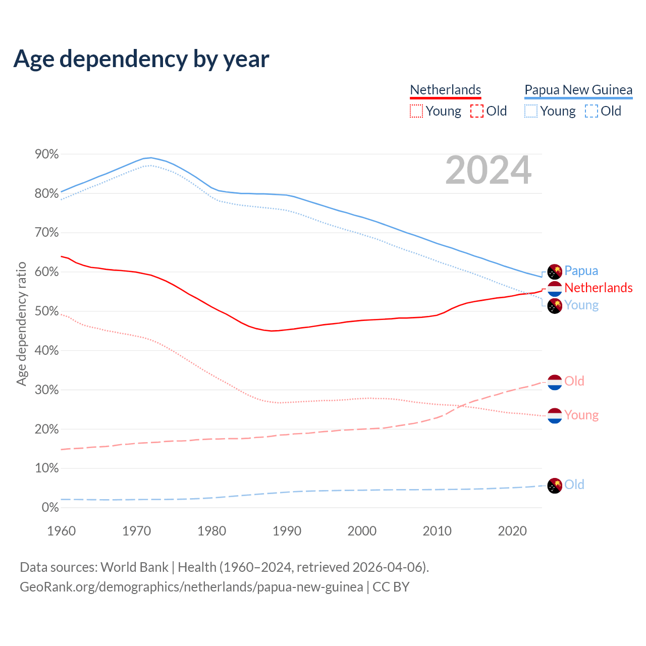 - The share of old-age demographic (65+) in the Netherlands is 20.5% vs 3.46% in Papua New Guinea.