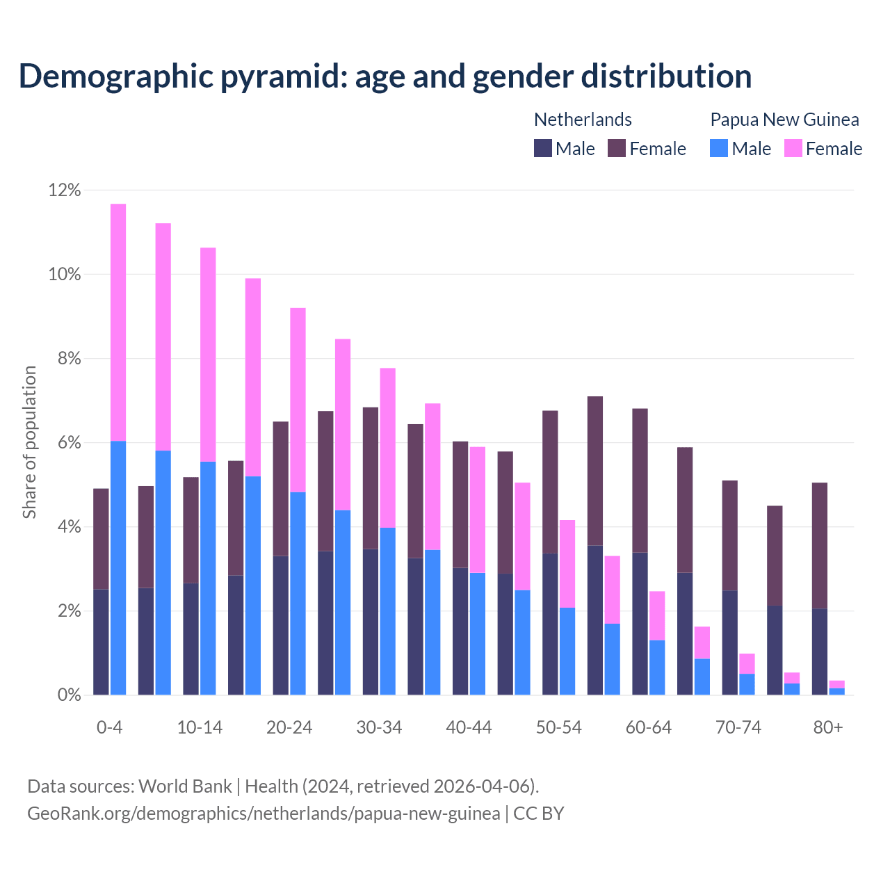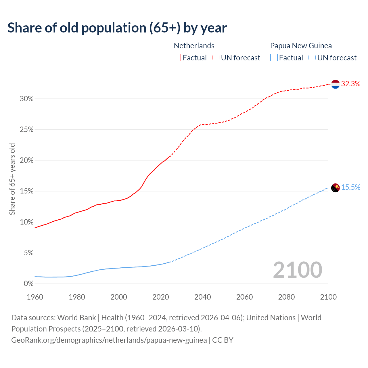The share of older people aged 65 and over is 20.5% in the Netherlands and 3.46% in Papua New Guinea. Life expectancy in the Netherlands compared to Papua New Guinea .
