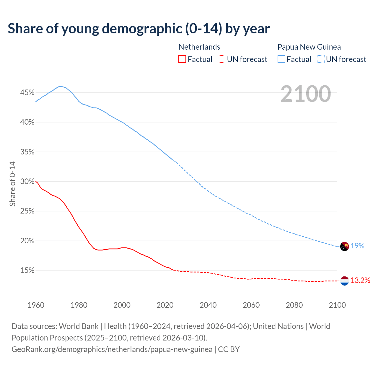 - The share of young demographic (0-15 years old) in the Netherlands is 15% vs 33.5% in Papua New Guinea.