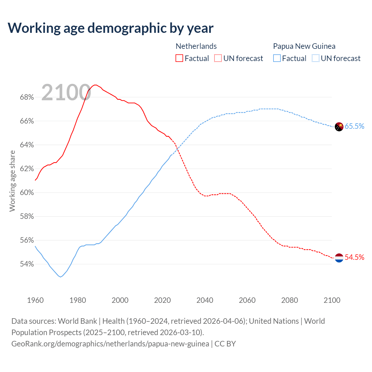 Median age Netherlands vs Papua New Guinea, 1960-2100
