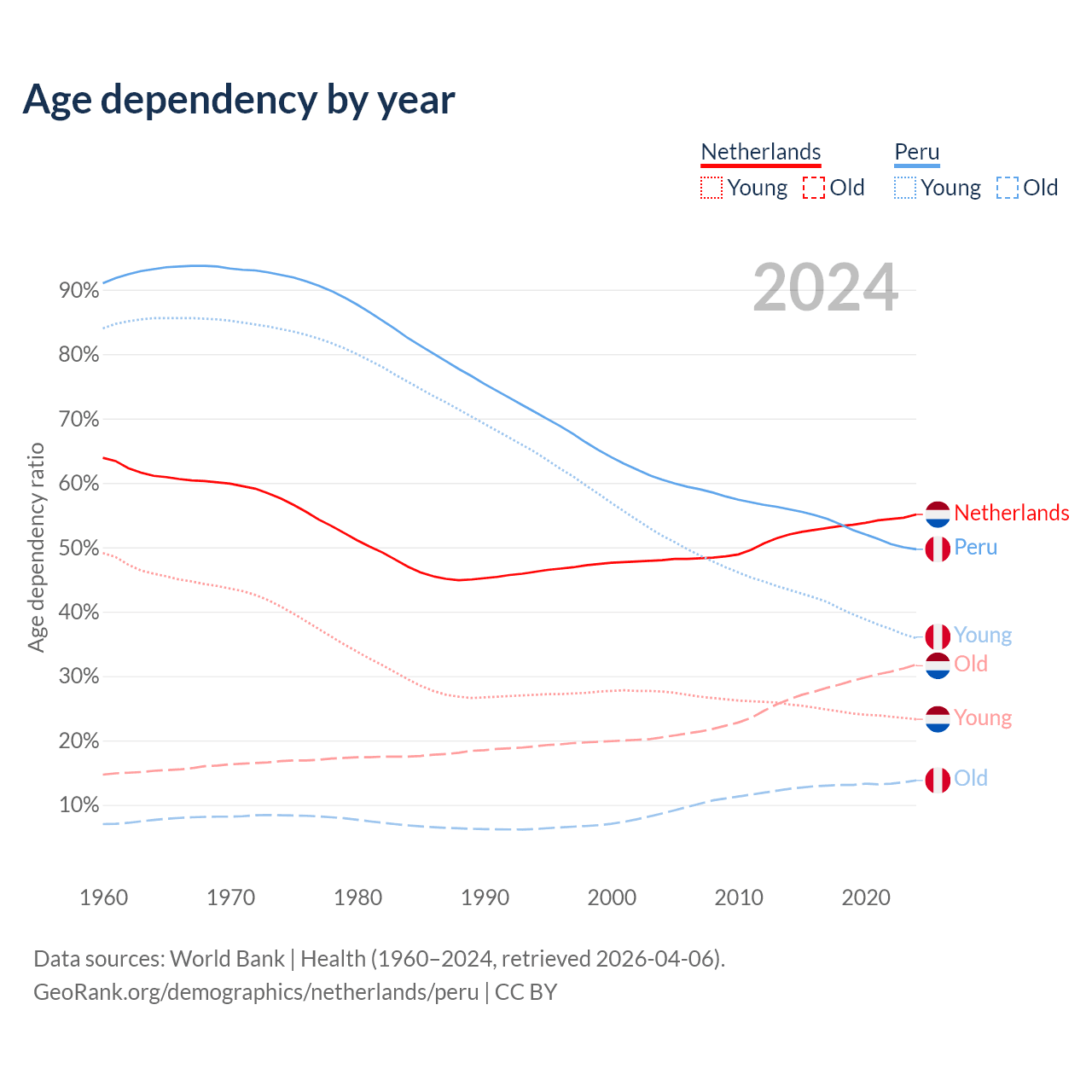- The Netherlands is ranked 33/196 by median age (oldest to youngest) vs 97/196 for Peru.