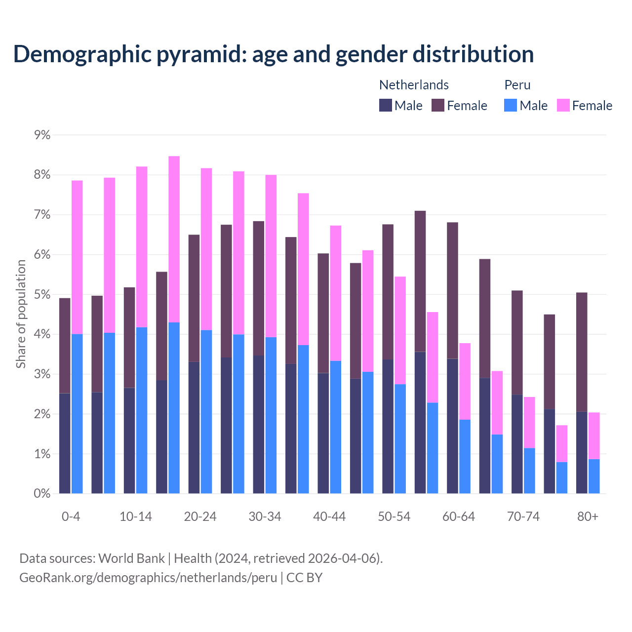 - The share of old-age demographic (65+) in the Netherlands is 20.5% vs 9.23% in Peru.