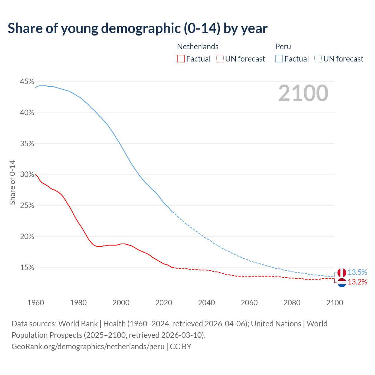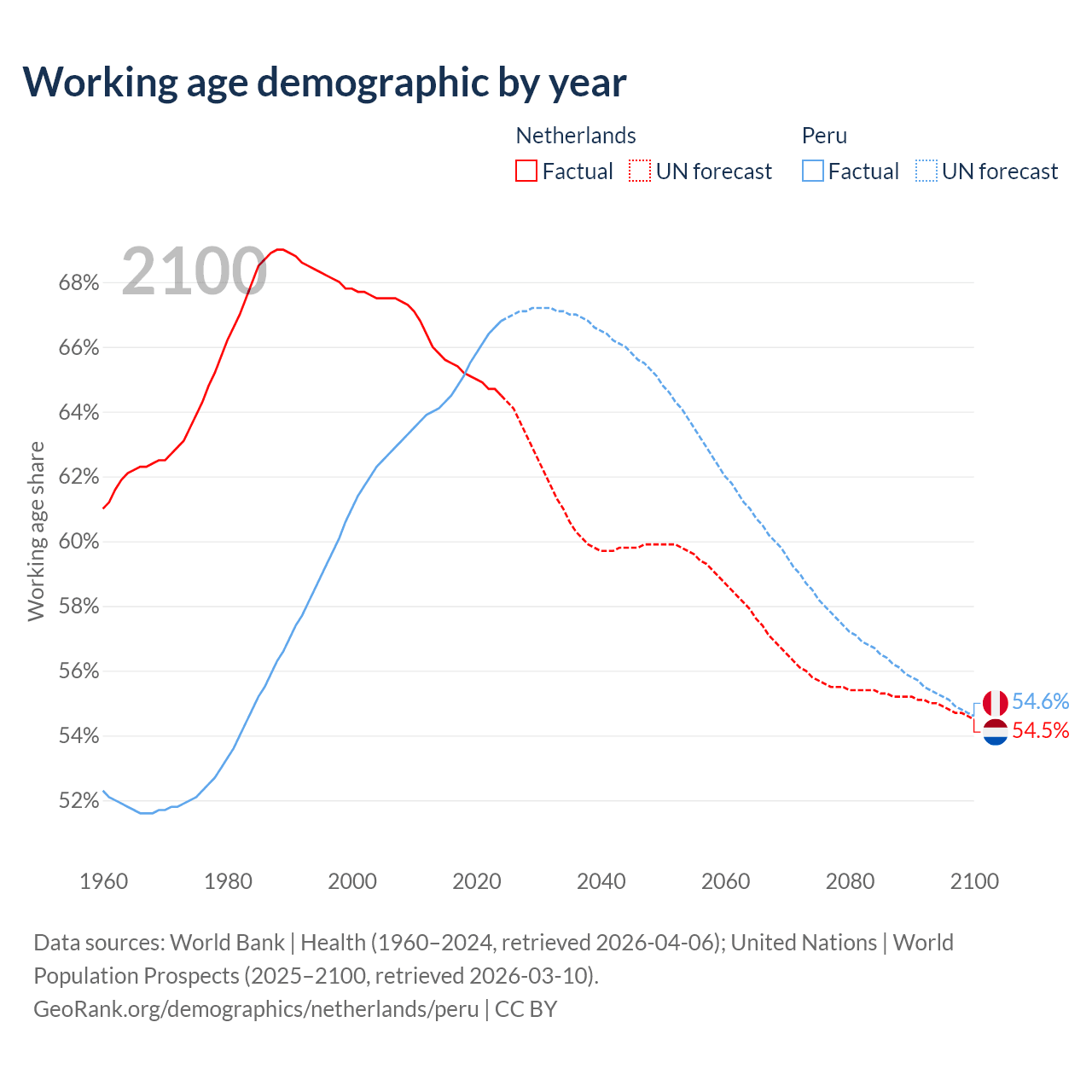 Median age Netherlands vs Peru, 1960-2100