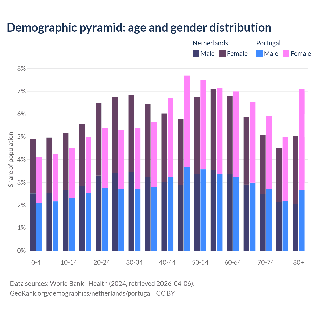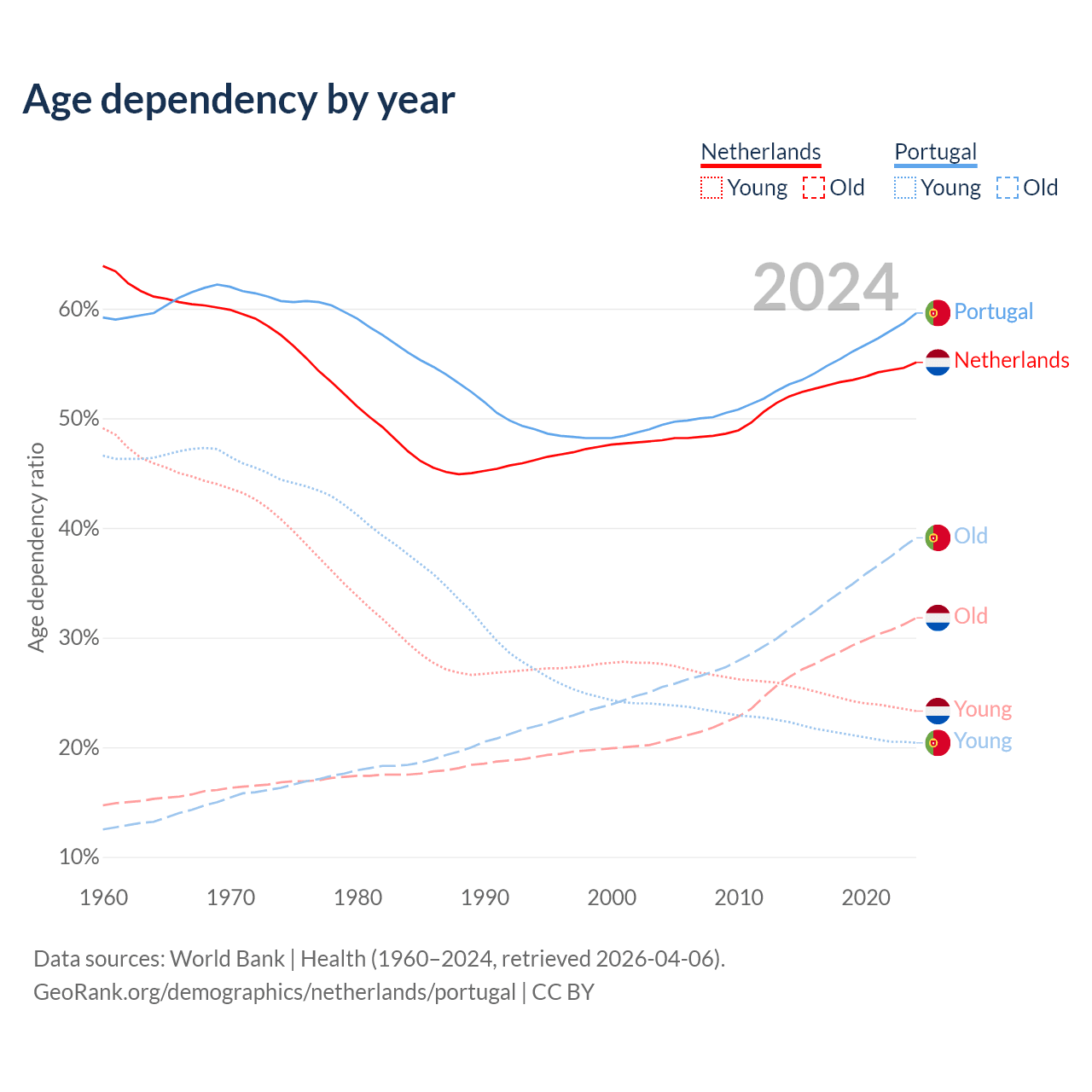 - The Netherlands is ranked 33/196 by median age (oldest to youngest) vs 5/196 for Portugal.