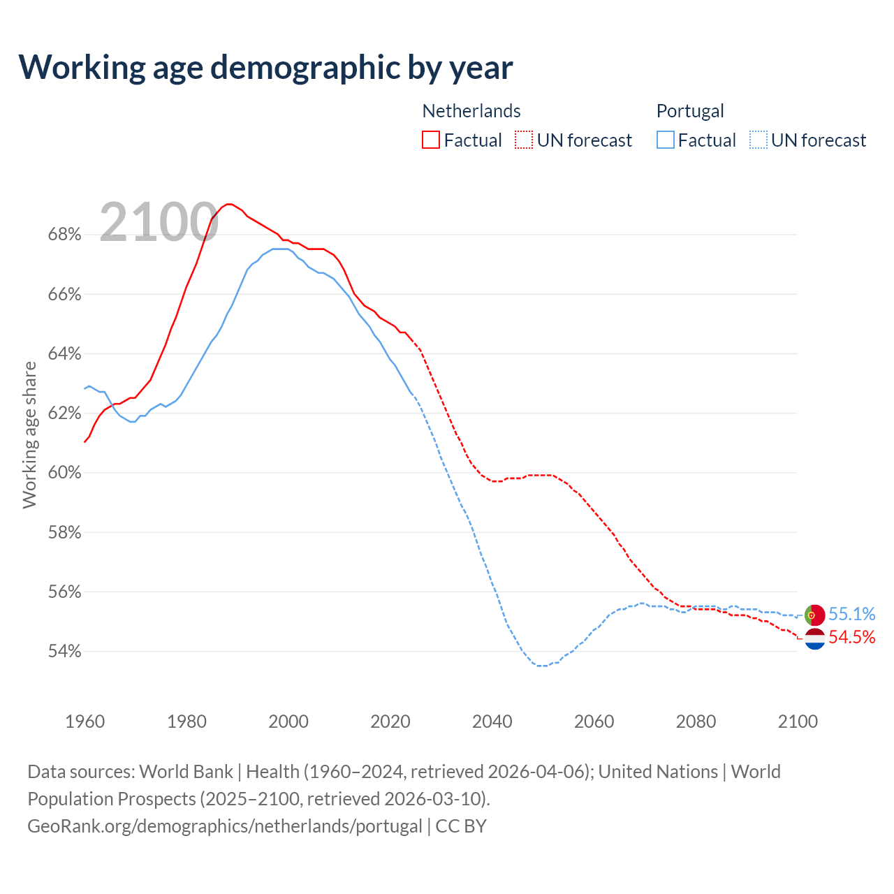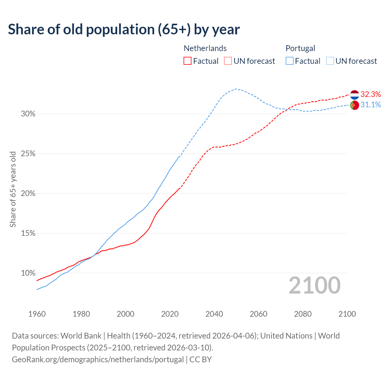 Median age Netherlands vs Portugal, 1960-2100