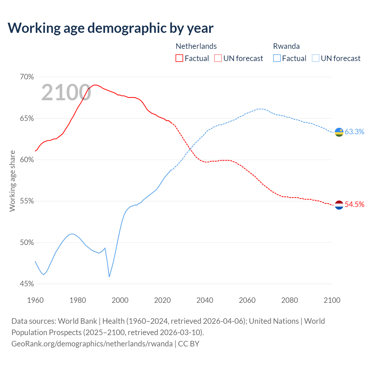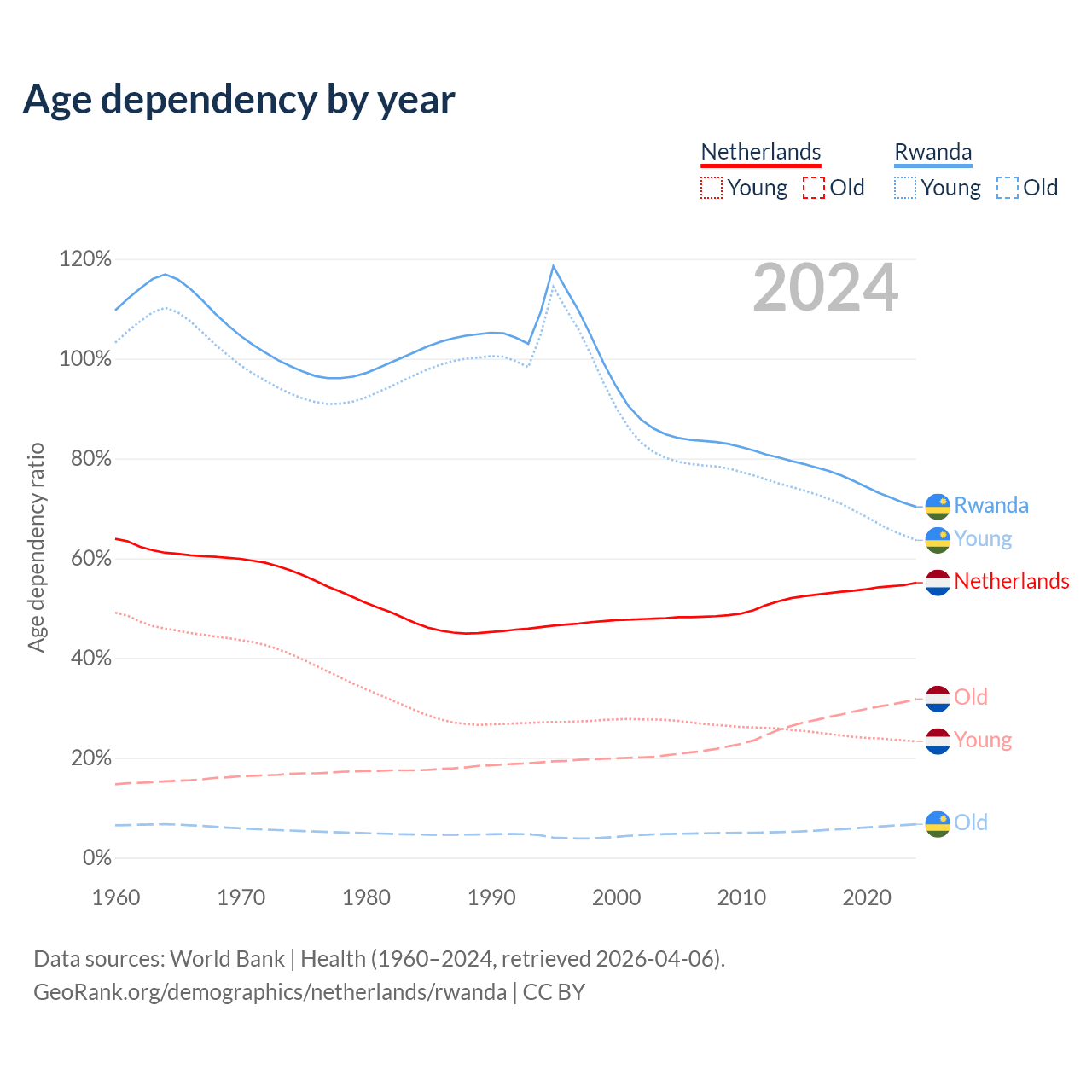 - The share of old-age demographic (65+) in the Netherlands is 20.5% vs 3.93% in Rwanda.