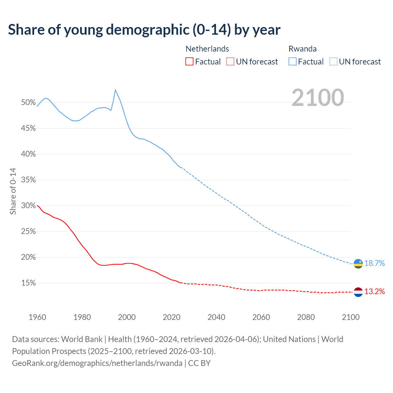 - The share of young demographic (0-15 years old) in the Netherlands is 15% vs 37.4% in Rwanda.
